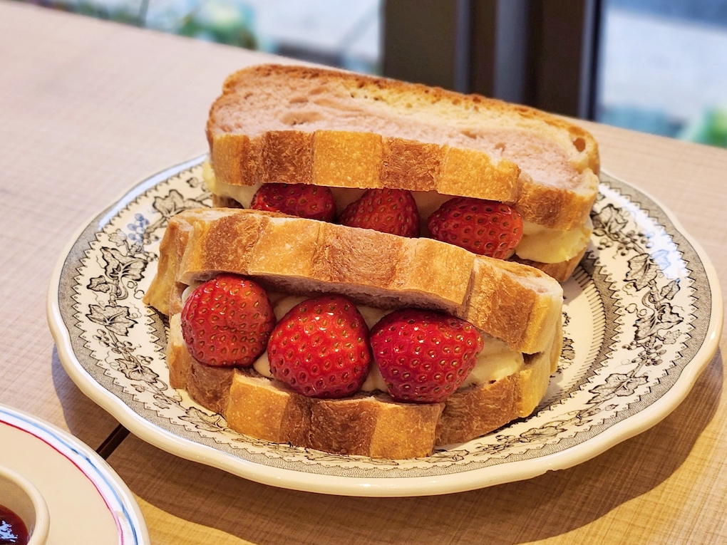 なかでも黒猫のお気に入りは、スタンドとは別添えで、ジアンのプレートで提供される“いちごとカスタードのパンブリエサンド”。