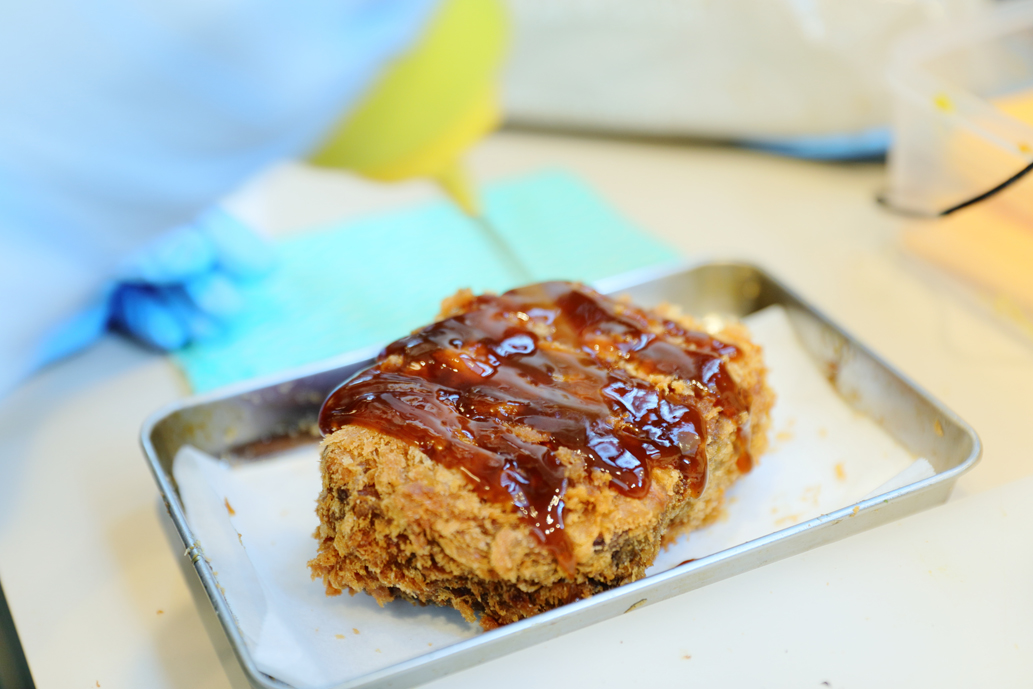 かつサンドは注文が入るごとにひとつずつ作っていきます。とんかつにかけるサンド専用のオリジナルソースは、岡山産の高級トマトを使ったもので、甘味や酸味、うま味のバランスにこだわった自信作。もちふわ食感が特徴の湯だね食パンにサンドしたあと、ペーパーにくるんでからナイフでカットします。