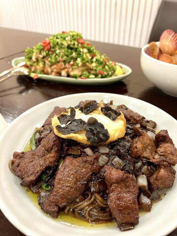 こちらの料理は、人気の「ステーキトリュフジャージャー麺」。韓国と中国のフュージョン料理の代名詞でもある“ジャージャー麺”の上に、ビーフステーキとスライストリュフがのっています。大満足のボリュームながら、トリュフの風味とジャージャー麺のタレの甘みの相性がとても良く、その味にも人気の理由があります。このメニューは、韓国映画「パラサイト」に登場した「ジャパグリ」というインスタントラーメンに似ているということでも話題にもなりました。