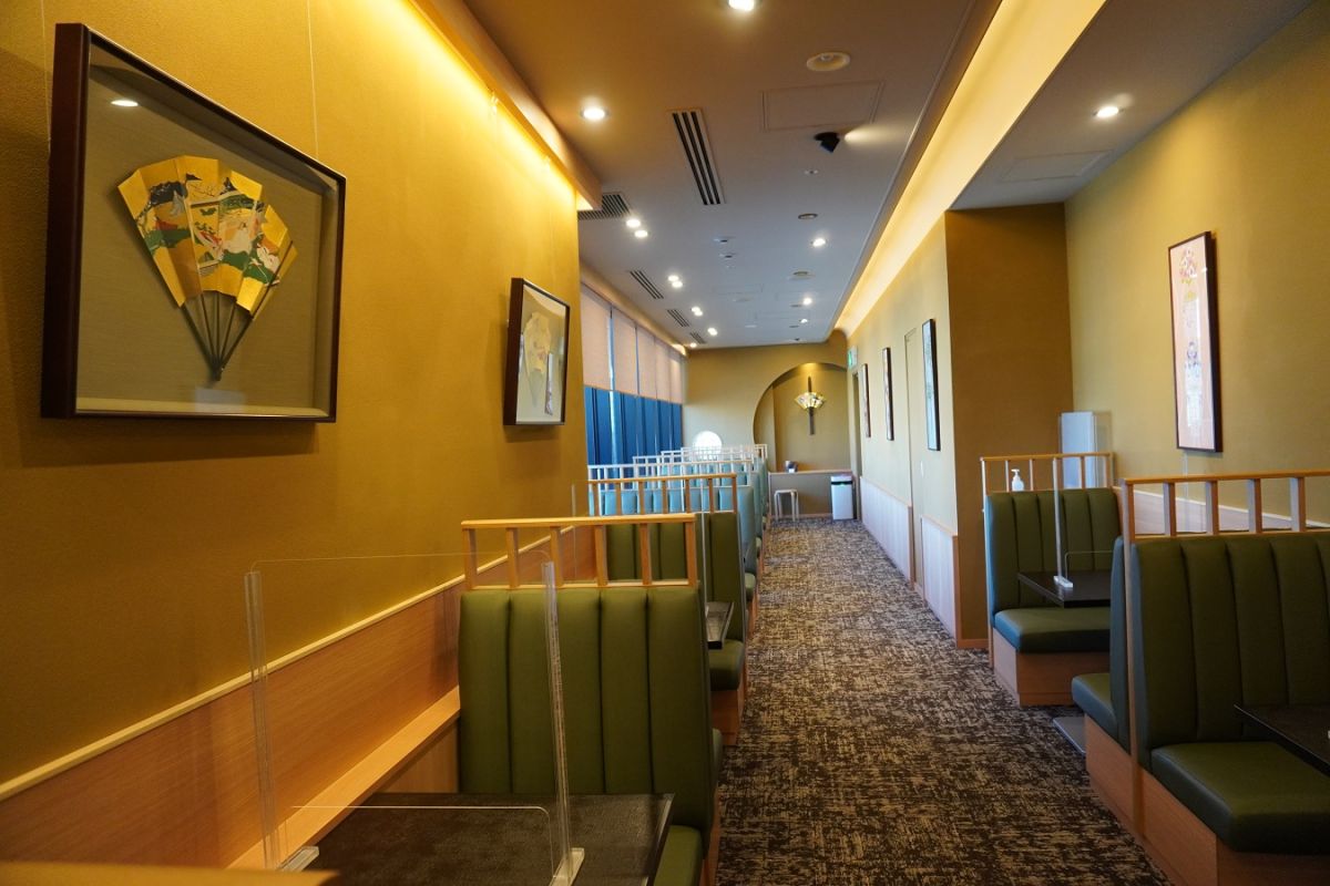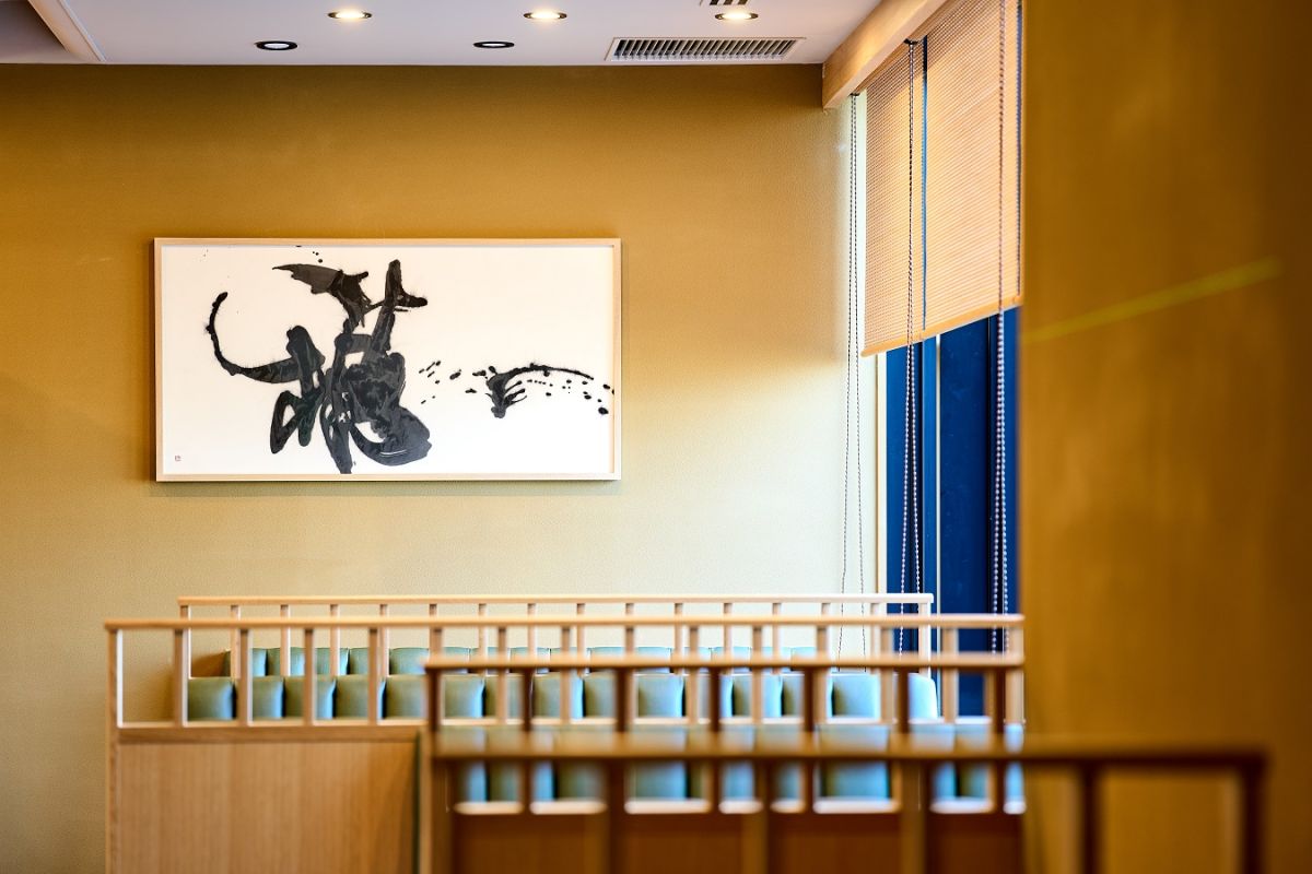 店内は居心地のよい、落ち着いた雰囲気。さりげなく飾られた美術品などから、季節を感じられる素晴らしいしつらえも魅力です。壁に飾られた華やかな「源氏物語飾り扇子」は、京都在住の有職彩色絵師、林美木子さんの作品。月替わりで3枚ずつ展示され、雅な京の四季を感じることができます。