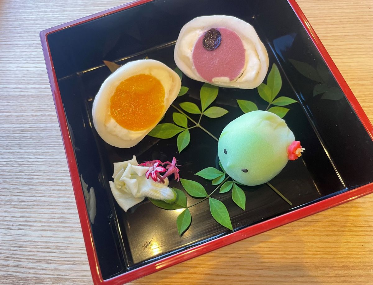それぞれの段は、お餅を使った和菓子が入った「おもち箱」。昔ながらの京菓子に生クリームやチョコレート、フルーツなどを組み合わせた、親しみやすい革新的なおいしさが詰まっています。