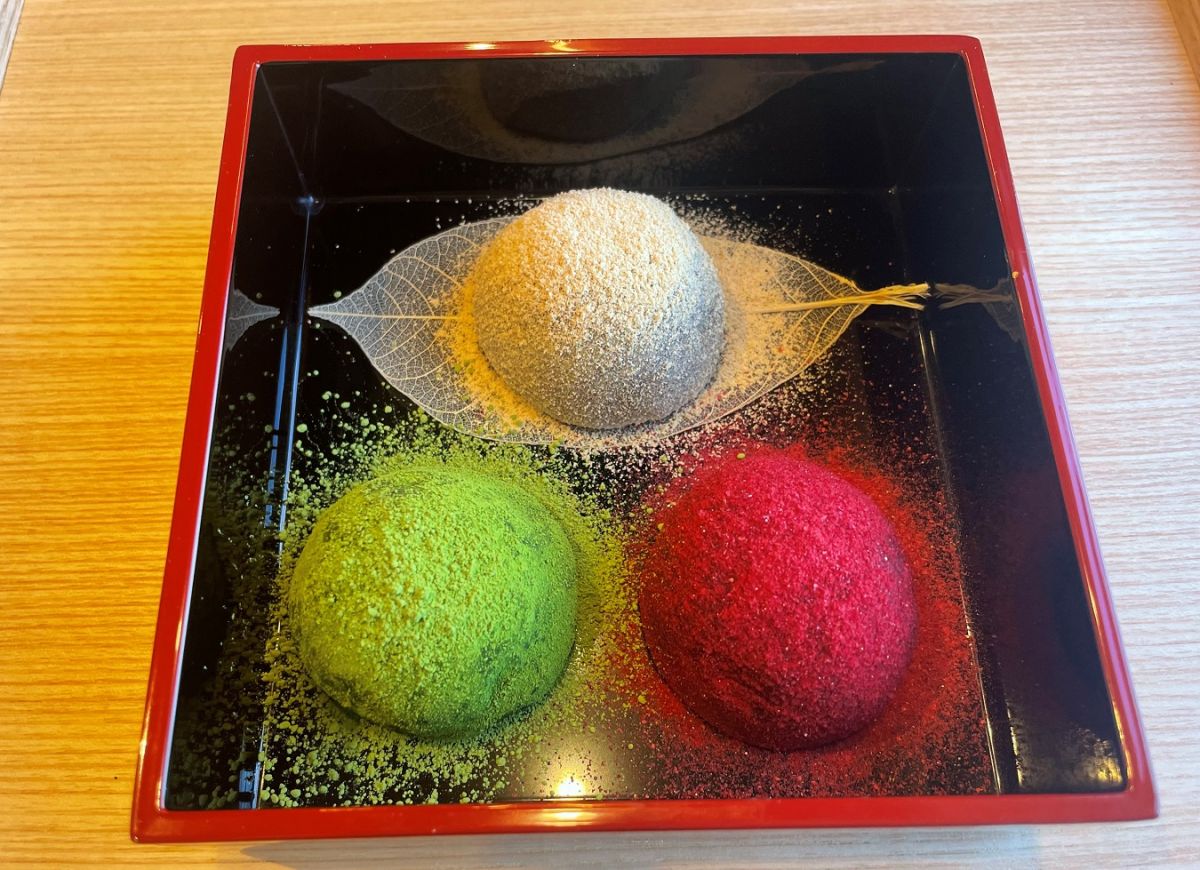 三の重は「わらび餅」。きなこがかかった和三盆生地に特製餡が入った「早蕨(さわらび)」、赤い色が鮮やかな、ラズベリー生地にこし餡と生クリームが入った「あけぼの」、抹茶生地の中にムースリーヌと生クリームが中に入った「松緑」の3種類。どれもおいしそうで、どれから食べようかと迷ってしまいます。
