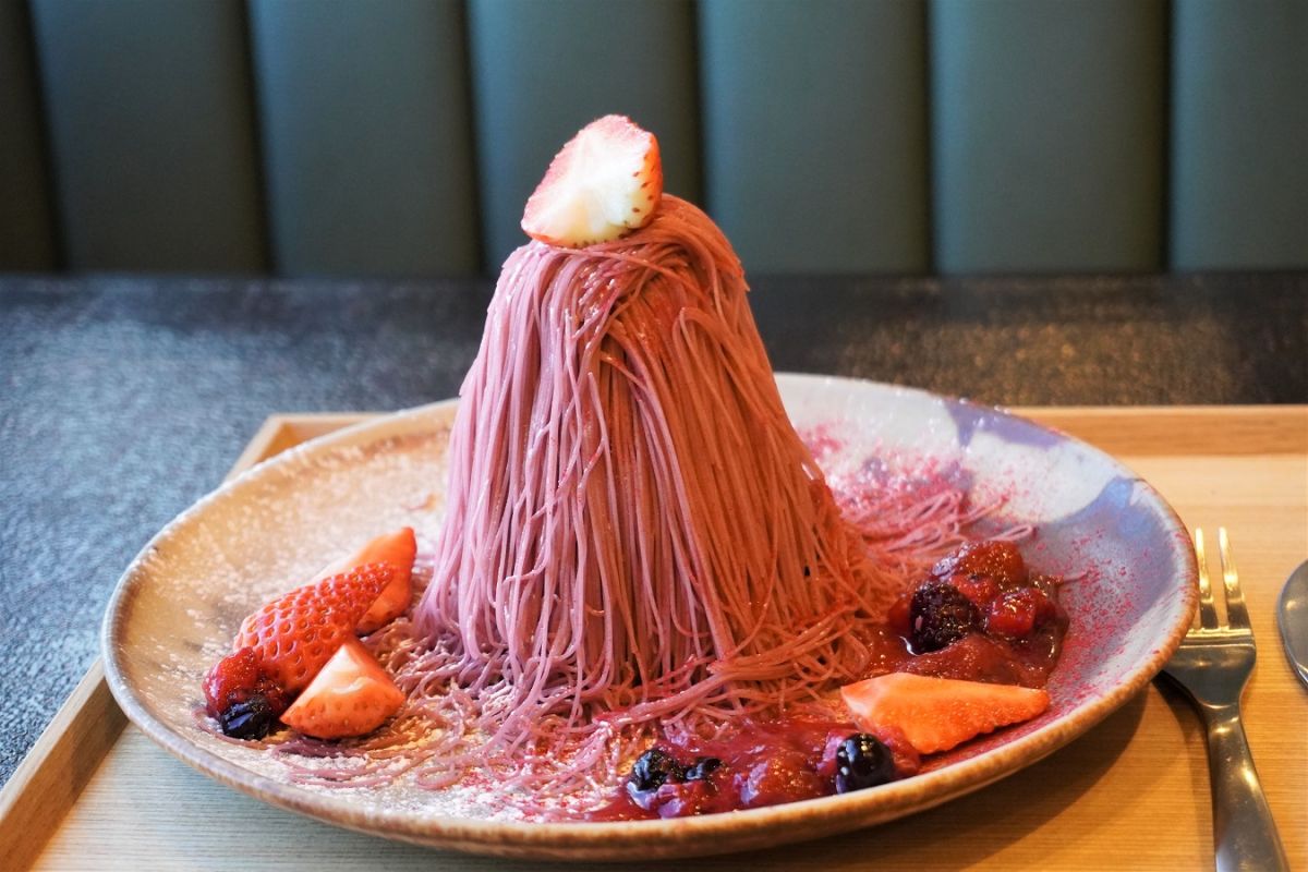 モンブランも、お目当てに訪れるお客さんが多い大人気メニューです。定番メニューの、ベリーをたっぷり使用した「緋色のモンブラン」1980円(ドリンク付2480円)と、毎月素材のフルーツが変わる「月替わりのモンブラン」の2種類があります。こちらのモンブランは、白餡をベースに使っているのが特長で、和洋折衷のやさしい味わいと食べやすさが人気。器にもこだわっていて、信楽焼の美しい焼き色にも注目です。