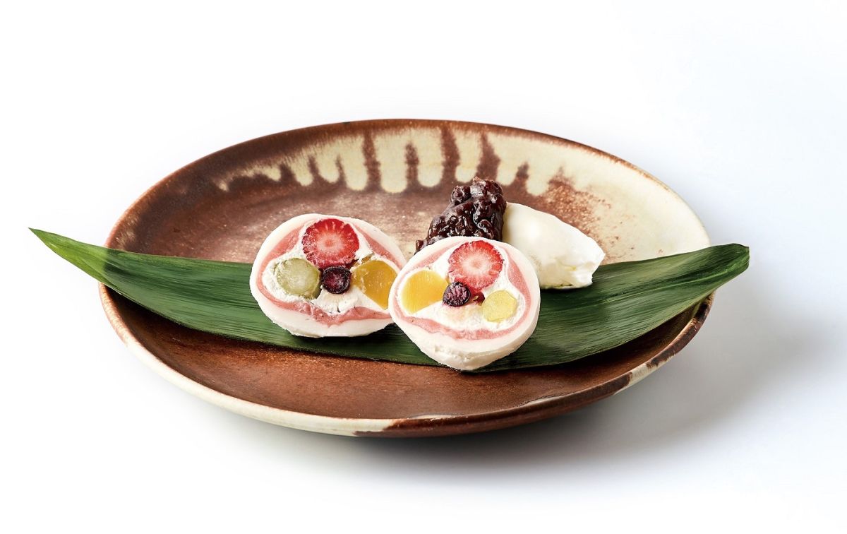 こちらは「祇園ぽっちり」1050円(ドリンク付1550円)。京都の舞妓さんだけがつける帯留め「ぽっちり」をイメージしたフルーツ大福で、もともと「祇をん ににぎ」の看板商品です。JR京都伊勢丹地下1階にある祇をん ににぎの店舗でも販売しています。