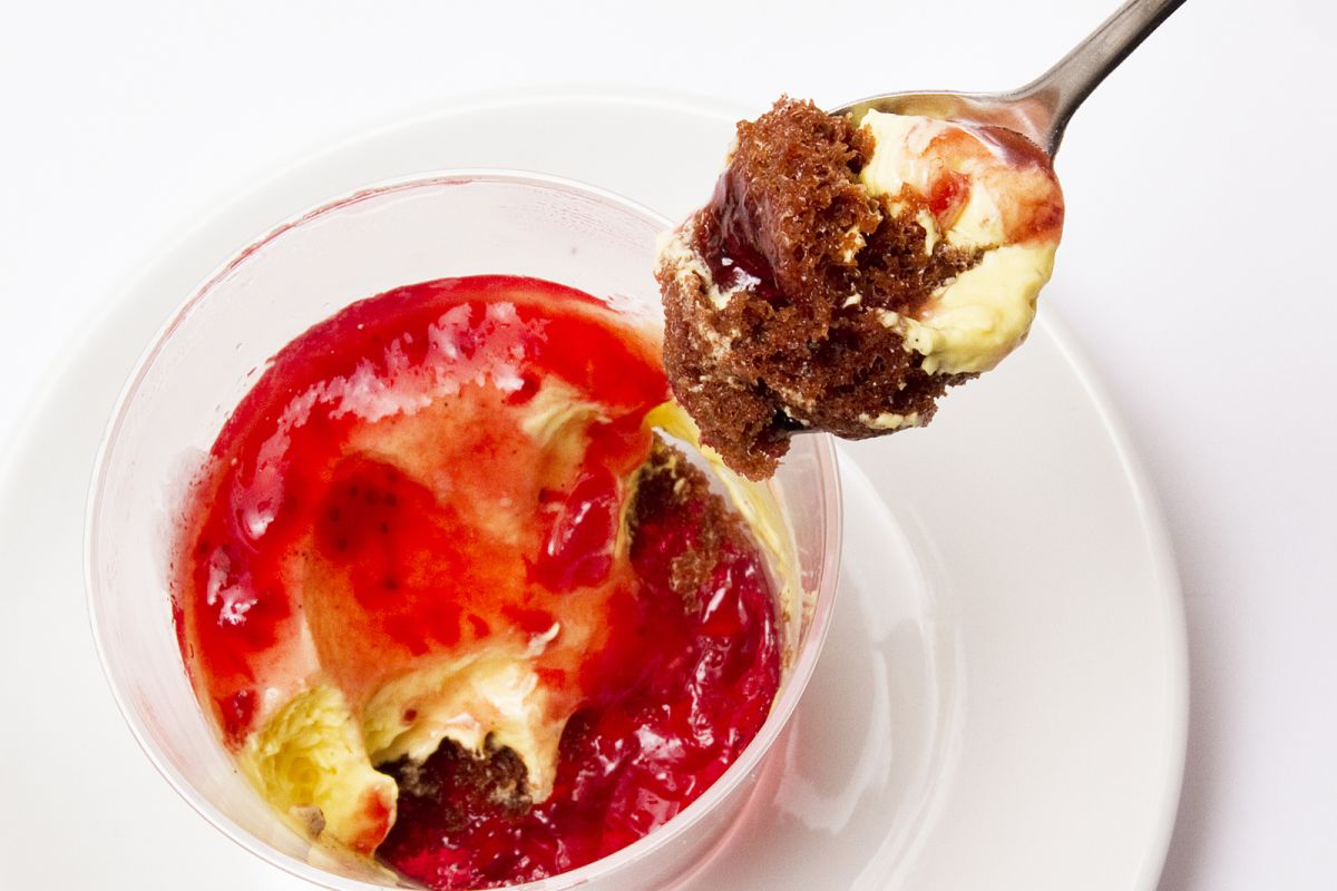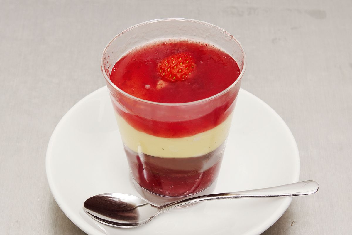 さらに、その下にはビターなココア味のスポンジ生地、一番下には苺やフランボワーズ風味の深紅のゼリーが入っています。