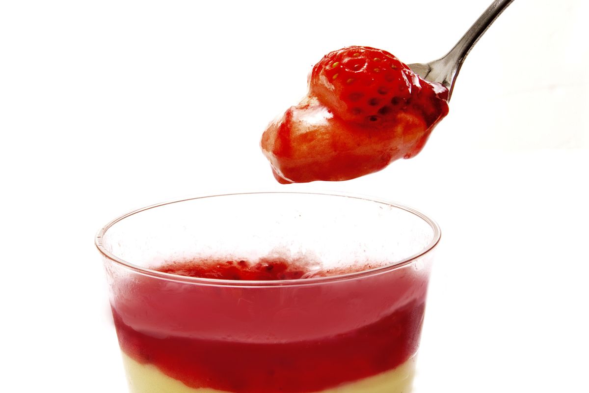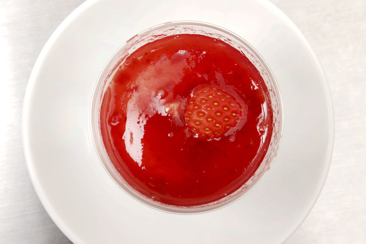 上から眺めてみると、とろりとした苺ソースの中に小ぶりで愛らしいフレッシュ苺(1/2個)が浮かんでいます。