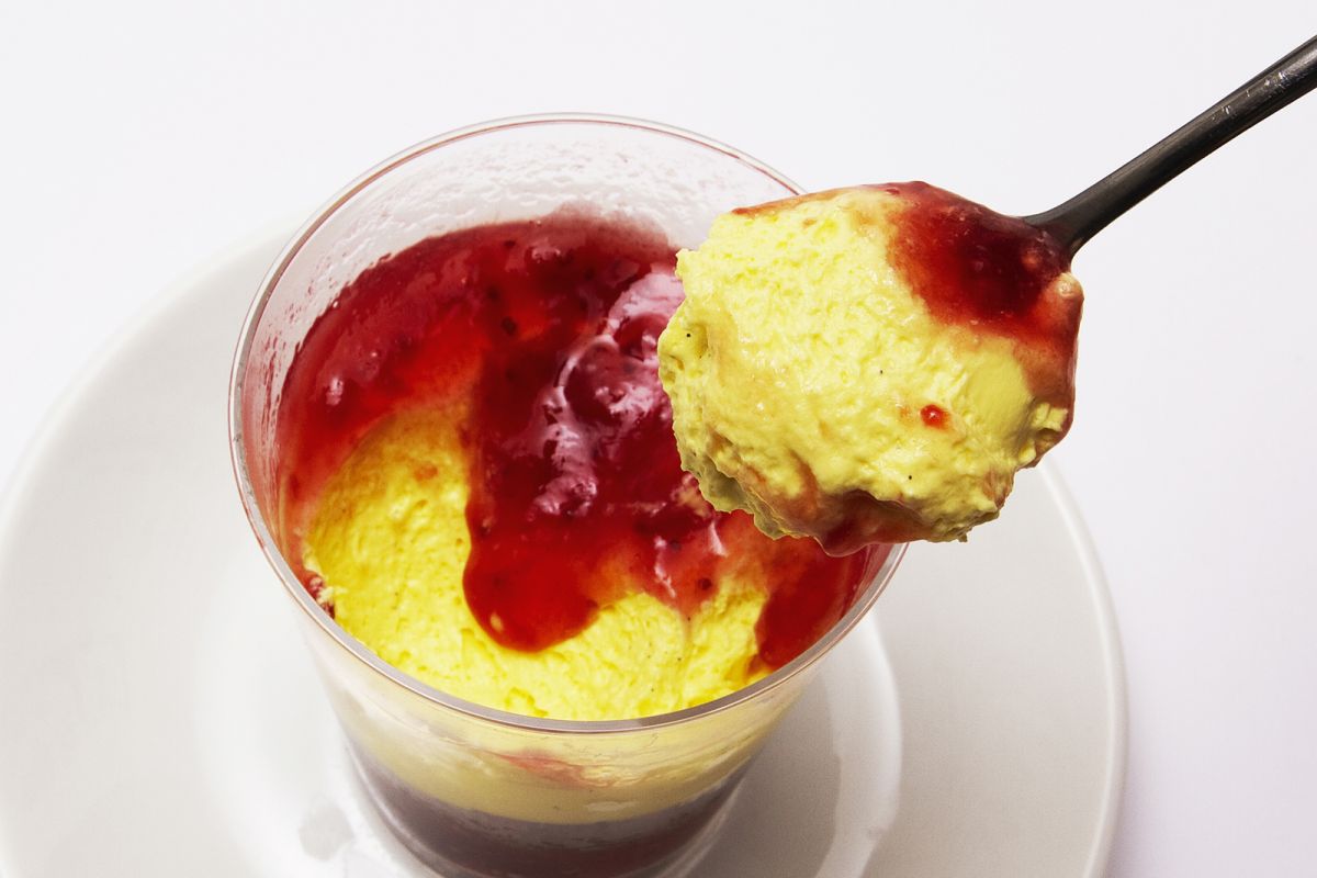 そのままスプーンで掘り進めると、下からふわふわカスタードクリームが登場。黒いバニラの粒々も見える甘い香りのクリームは甘酸っぱい苺ソースとの相性がよく、どんどん食べ進められちゃいます。
