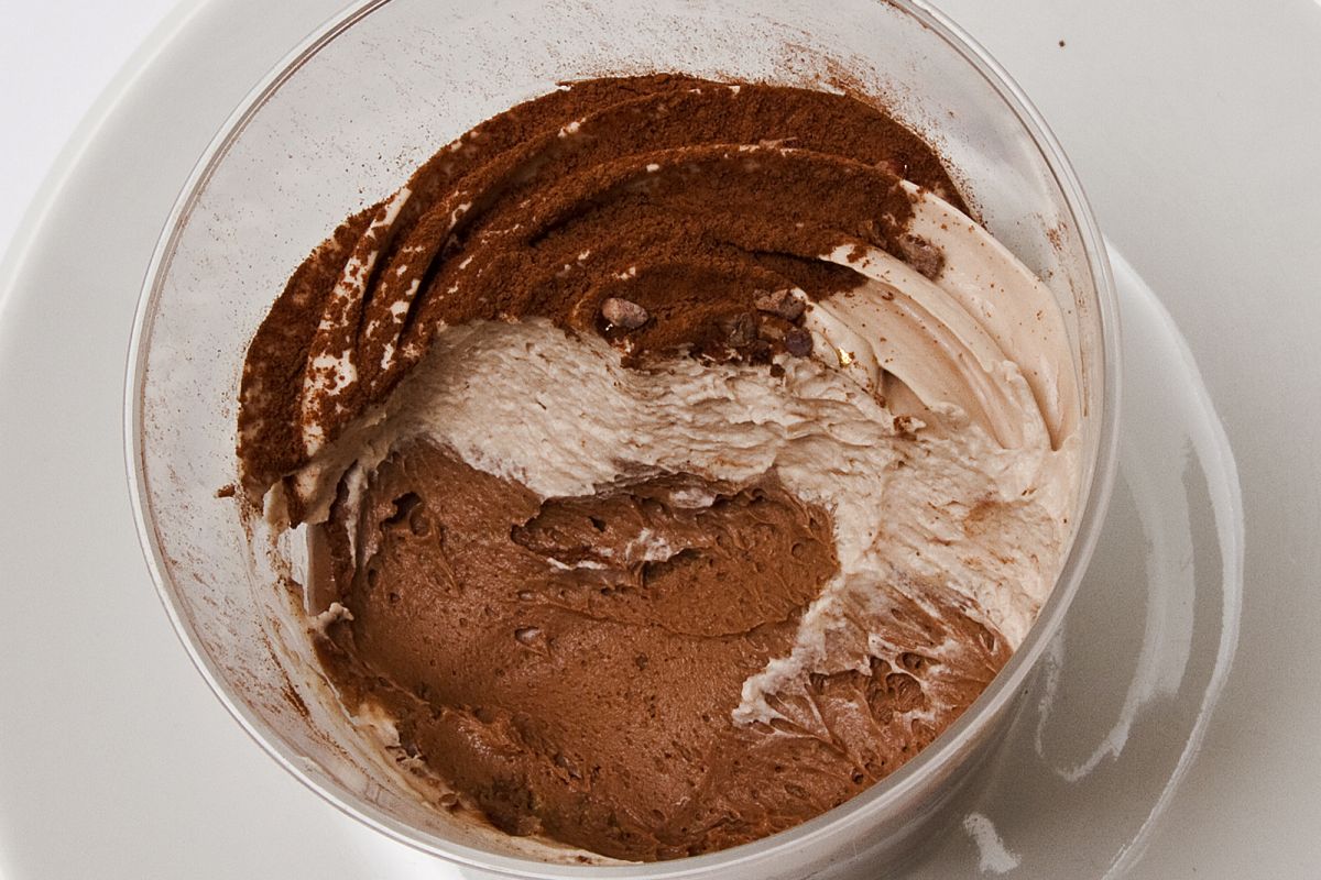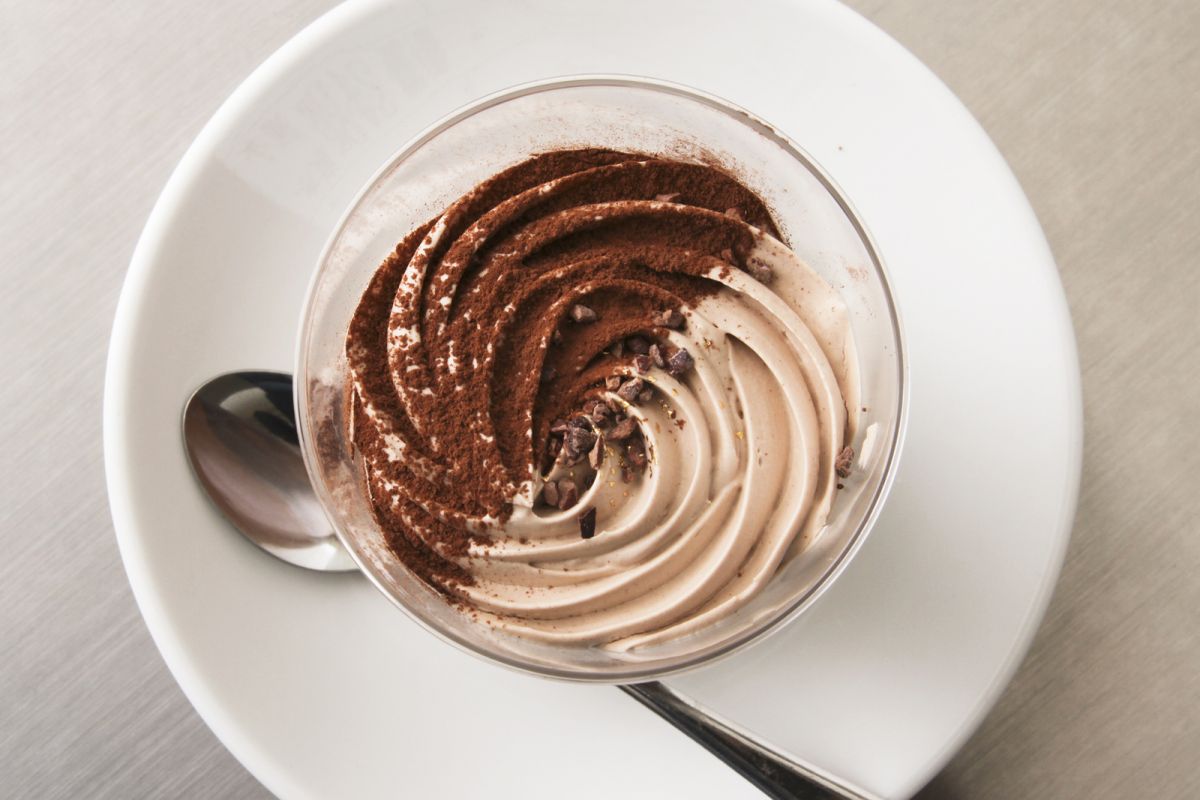 上から眺めると、ミルクチョコクリームの上に半分ココアパウダーがかかり、小さく砕いたカカオニブ、ゴールドに色付けされた粒々状のものがトッピングされています。シックでありながらもゴージャス感を漂わせていますね。