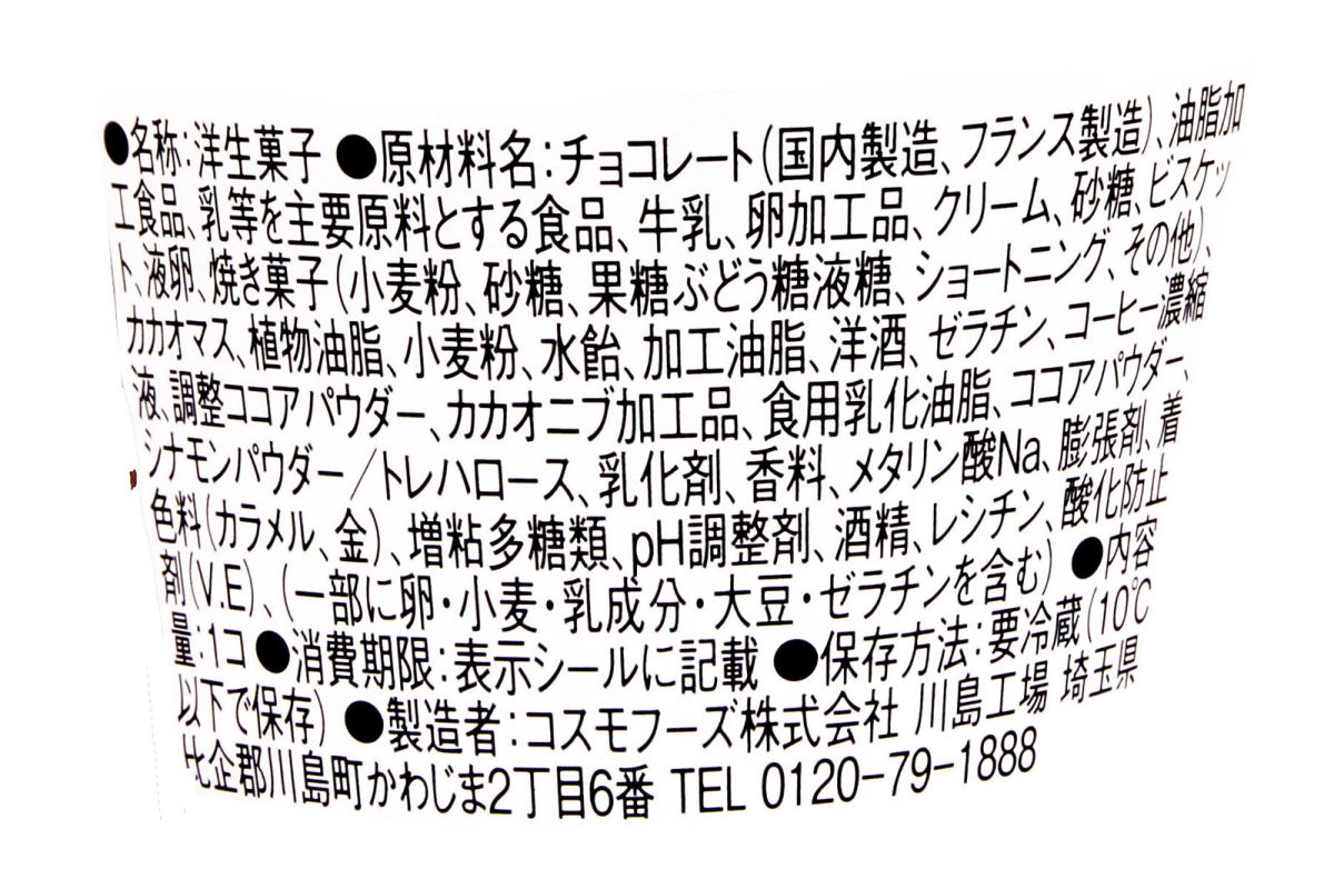 ふたを開けるとチョコとブランデーの芳香が立ち上りますが、意外とアルコール分は低く1個あたりのアルコール分は0.3%(計算値)。