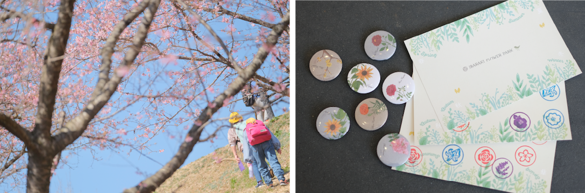 桜シーズンのおすすめアクティビティは「四季の花めぐりスタンプラリー」100円。広い園内8カ所に設置されたお花スタンプを押しながら、自分だけのポストカードを作る「四季の花めぐりスタンプラリー」を楽しむことができます。お花見をしながら思い出のポストカードを完成させましょう!桜のスタンプを見つけると、お花のオリジナルイラストが描かれたボタニカル缶バッチをゲットできちゃいます。