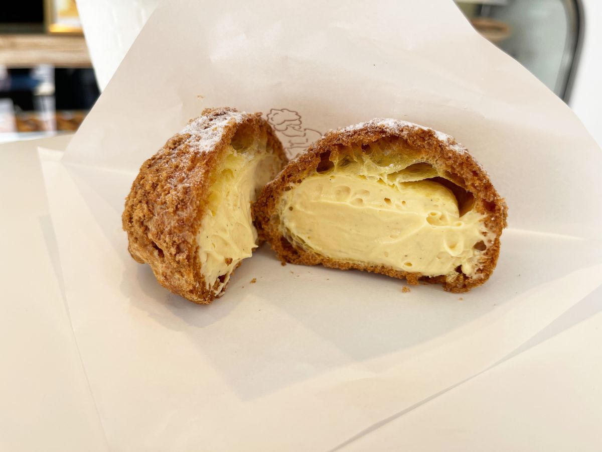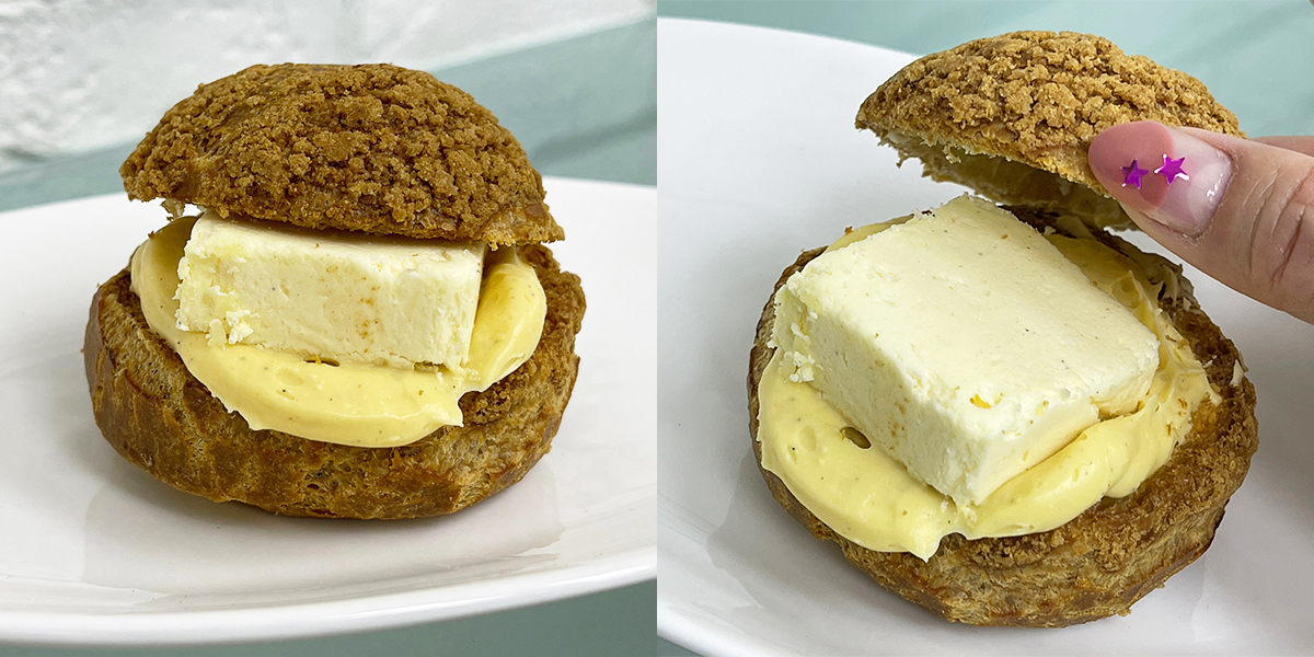 クッキー生地のシュー皮と一緒に頰張ると、クリームのなめらかさとシュー皮のサクサク食感が合わさって口の中に幸せが広がります。ボリューム感も程よく、おやつタイムにぴったり!