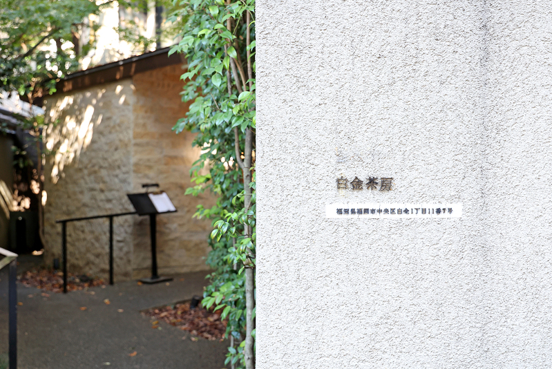 西鉄薬院駅から徒歩7分、店名の由来ともなった福岡市中央区白金の閑静な住宅街に立つ「白金茶房」。目印は、ピンクの丸い看板と外壁に慎ましく掲げられた屋号です。