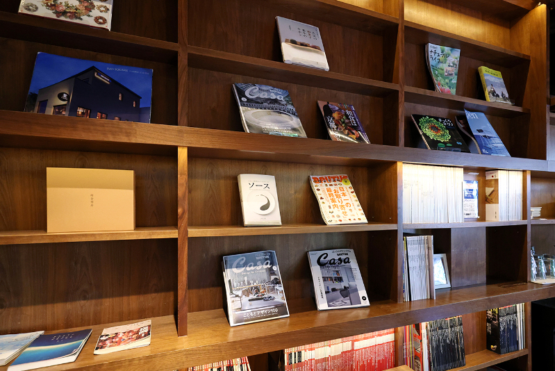 1階は壁一面が本棚となっているブックカフェスタイルで、しっとりと落ち着きのある設え。本棚にはさまざまな書籍や雑誌が並び、好きな雑誌を読みながらコーヒーを飲んだり、食事を楽しんだりすることができます。 1人での利用もしやすく、本を持参してゆっくり過ごすのもおすすめですよ。