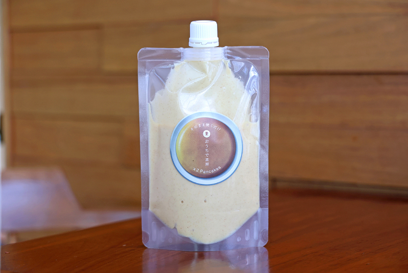 「自宅でもお店のような焼きたてを楽しみたい」という人には、生地の材料が入ったパック「おうちで茶房」770円(2枚分)がおすすめです。焼き方はいたってシンプル。中火で熱したフライパンに生地を流し込み、約3分半焼きます。生地にプツプツと穴が開き、フライパンを傾けても生地が流れないようになったら裏返し、もう片面も焼き色が付くまで焼けば完成。 初めに生地をよく揉んでおくことと、火を強くしすぎないようにするのがきれいに焼くコツです! 鮮度を重視し、注文を受けてからパックに詰めているので、あらかじめ予約しておくか、時間に余裕をもってオーダーするのがおすすめです。