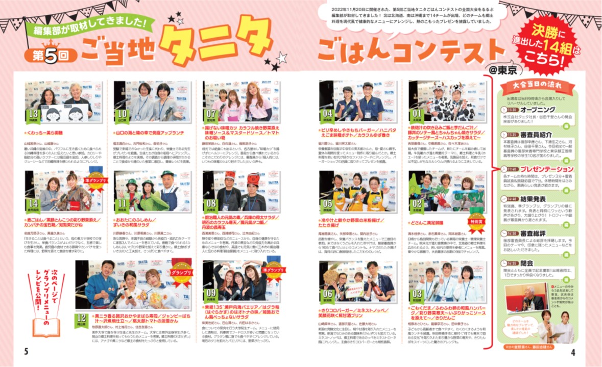 ご当地タニタごはんコンテストは、全国の郷土料理を「タニタが考える健康的な食事の目安」に基づき現代風にアレンジしたレシピのコンテスト。日本全国から大人から学生、子どもまでさまざまな人が参加します。