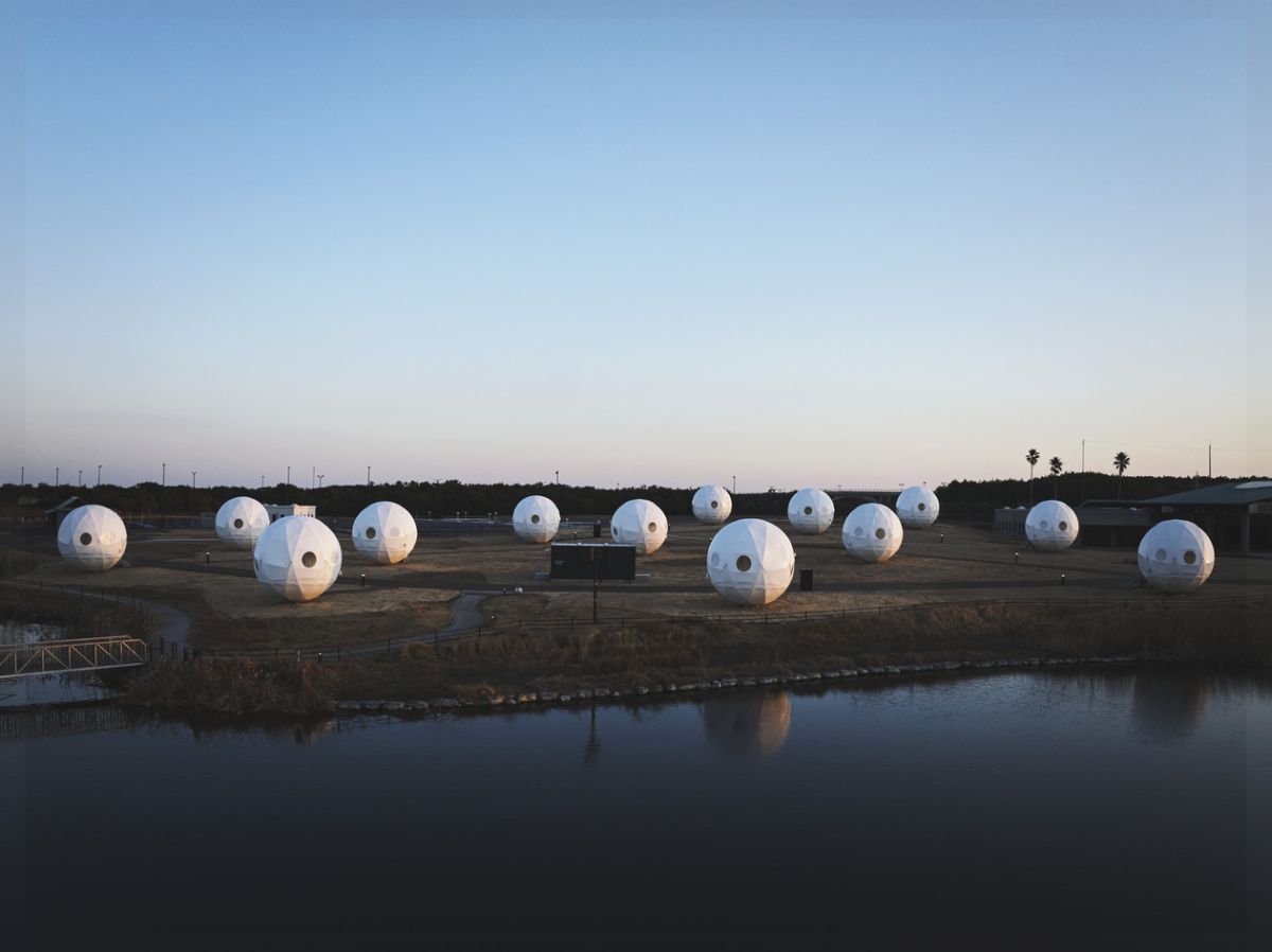 「INN THE PARK 福岡」は体験型の宿泊施設です。丸~い形がフォトジェニックな、直径約6mの球体テントは3名まで宿泊可能です。テント内は天井が高く広々としているので快適ステイが楽しめます。