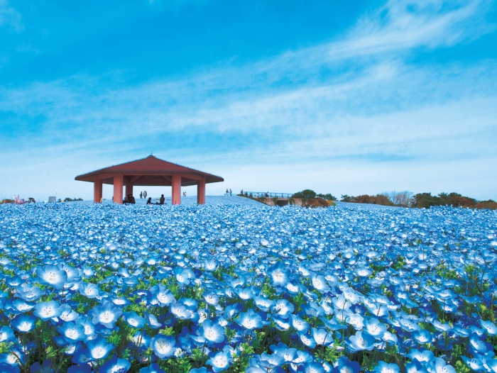 ネモフィラの見ごろは4月上~下旬。約120万本が一面に咲きます。視界いっぱいに広がる青いじゅうたんに、感動すること間違いなし。