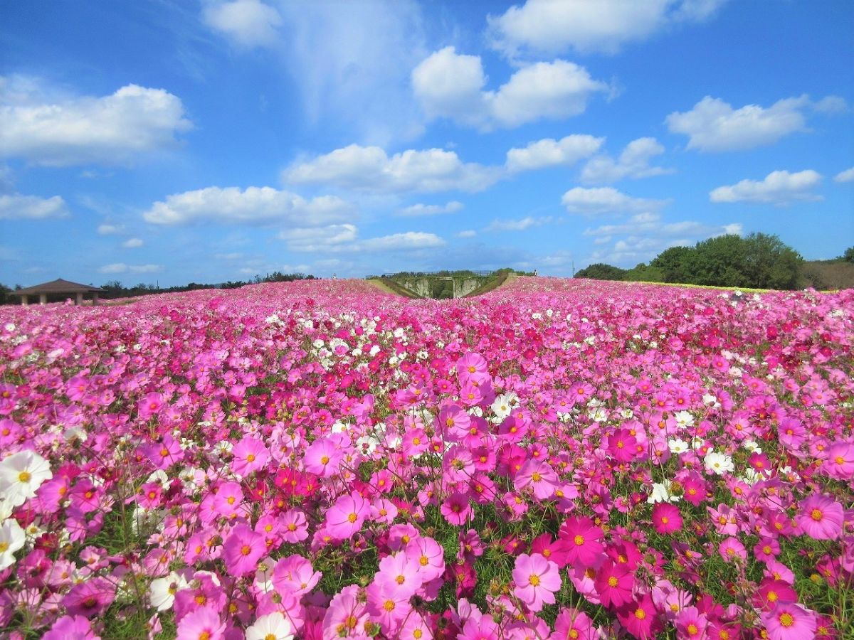 コスモスの見ごろは10月中~下旬。120万本のコスモスが丘一面をピンクに染める光景は見事です。ほかにも秋にはケイトウ、冬にはスイセンなど、一年を通して花を楽しむことが出来ます。