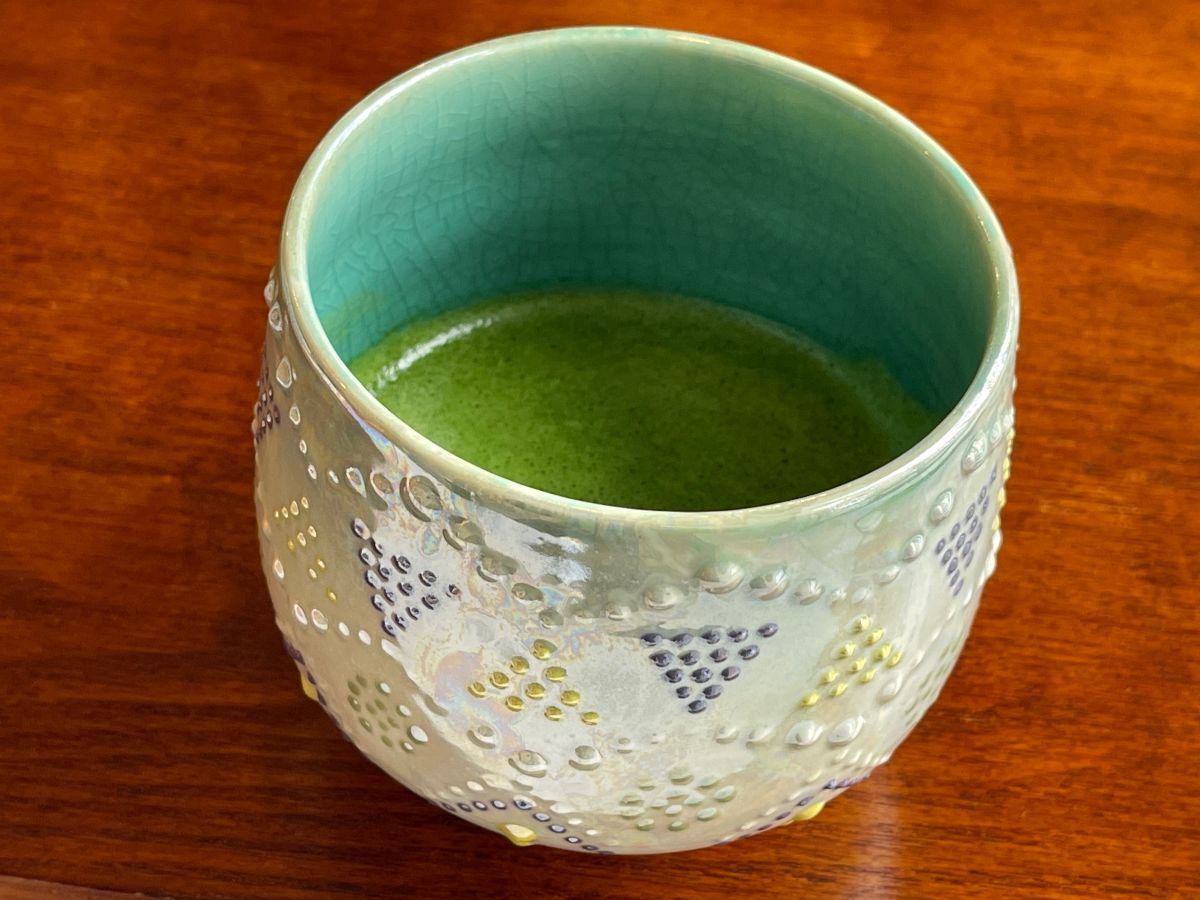 また、お皿や茶碗にもこだわっていて、写真の抹茶茶碗は唐津焼のもの。