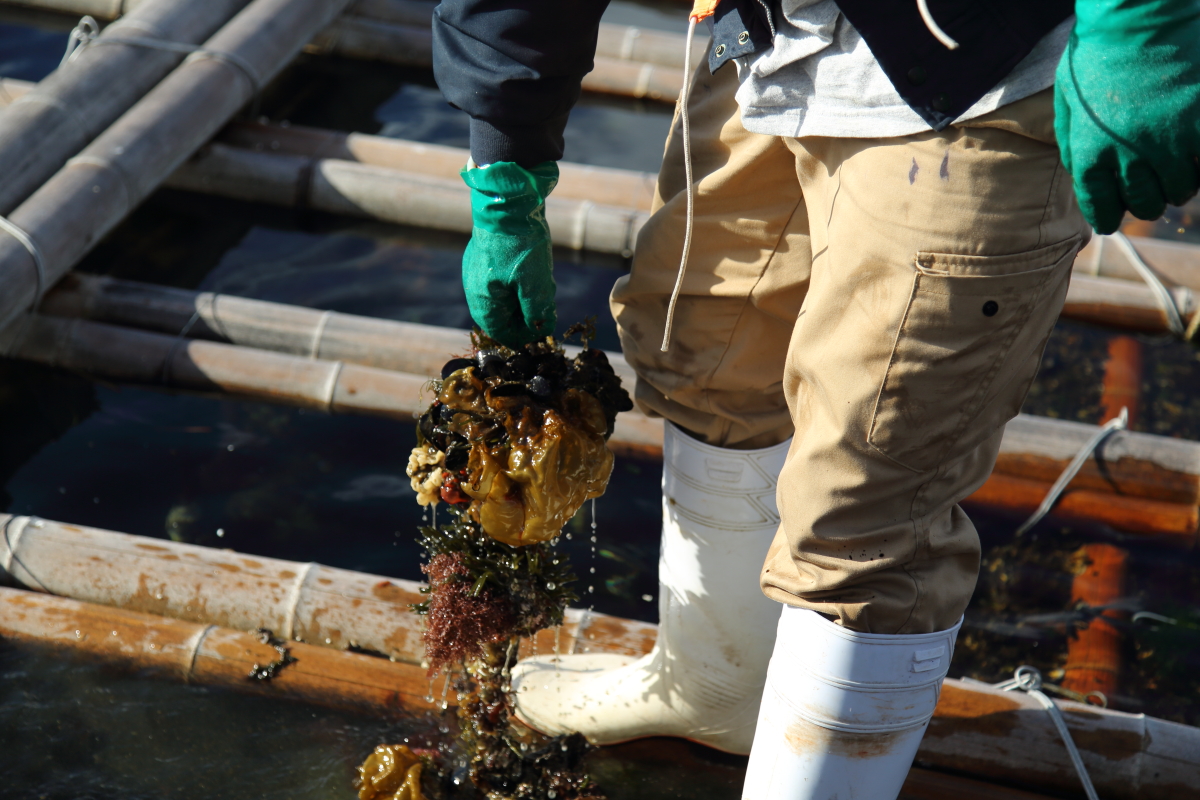 牡蠣養殖のため、海中に吊り下げる約10メートルものロープは垂下連(すいかれん)とよばれます。1本の垂下連につき300〜500個ほどの牡蠣が、さらにいかだ1台につき約50万個の牡蠣がとれるそうです!
