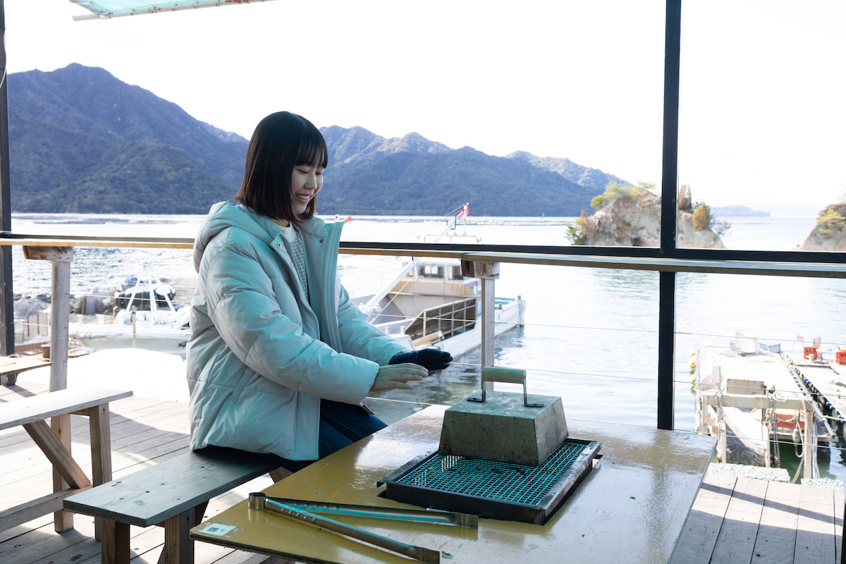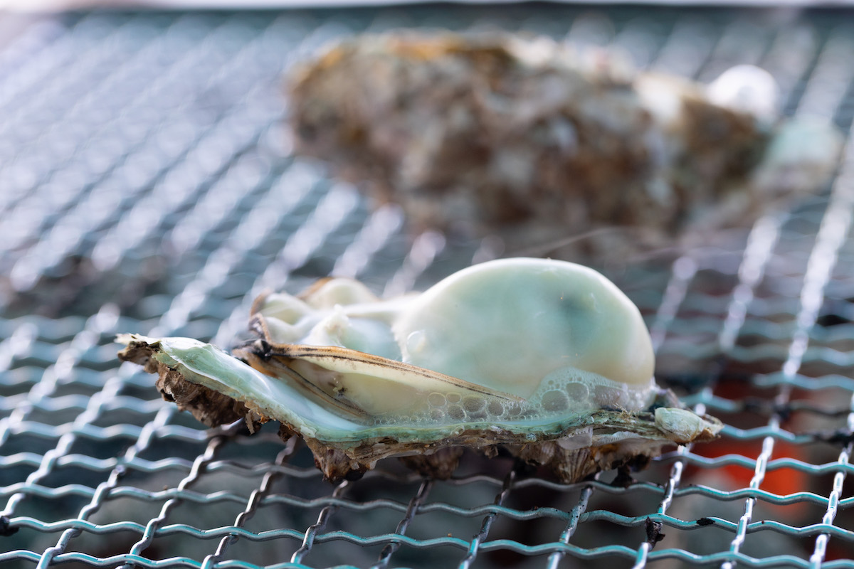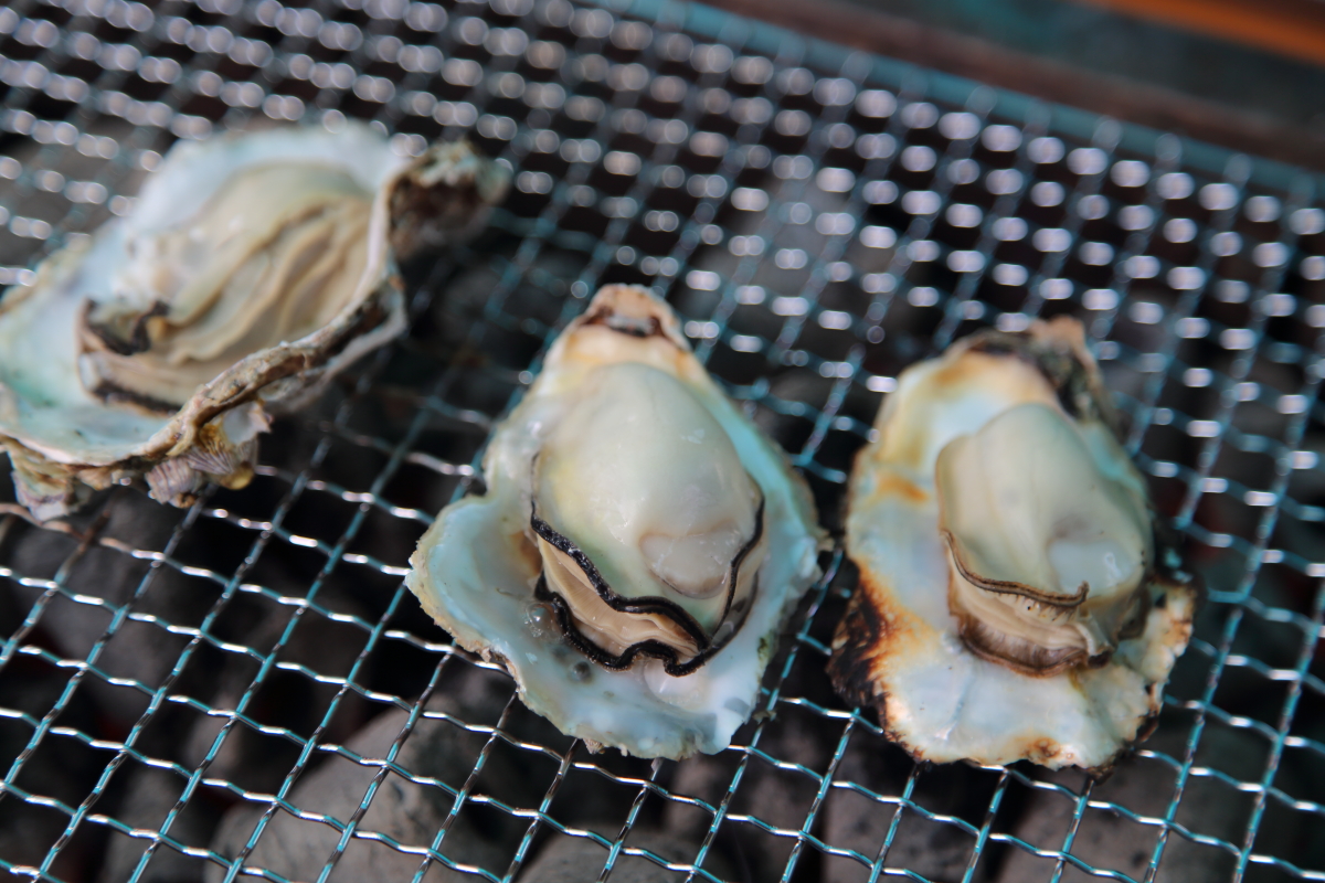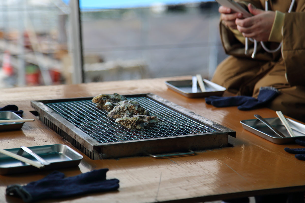 海上散歩の後は、お待ちかねの牡蠣小屋へ!先ほど見学した漁場を眺めながら、その場で焼いた真牡蠣をいただきました。牡蠣には大きく岩牡蠣と真牡蠣の2種類があり、10月〜ゴールデンウィーク前の時期は真牡蠣が旬。旨味の元となっているグリコーゲンがたっぷり含まれた真牡蠣はクリーミーで、まさに“海のミルク”。「島田水産」でいただける真牡蠣は1バケツ(8〜10個)で1100円です。