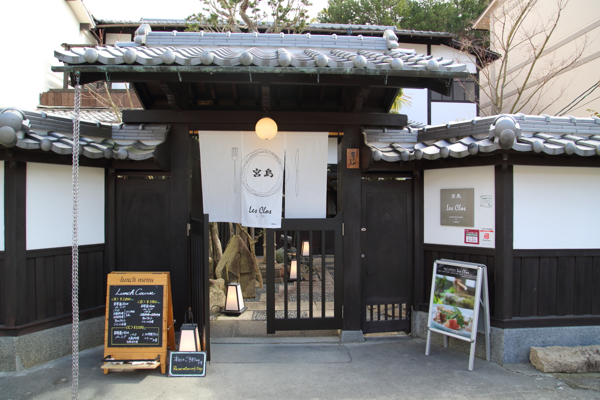 海沿いや表参道商店街を散歩しながら約7分、表参道からひと筋東の町家通りにある「宮島レ・クロ」へ。ここは、明治45年(1912)に建造されたという古民家をリノベーションして生まれ変わった、隠れ家のようなレストラン&カフェ。