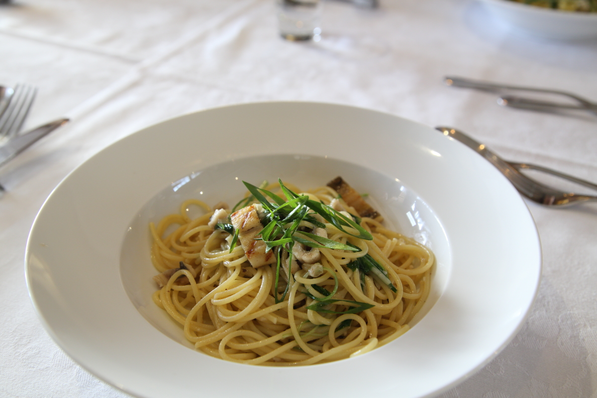 この日のパスタは「穴子のペペロンチーノ」。その名のとおり、淡白ながらも脂の乗った、ふわっふわの広島県産穴子が主役です。にんにく風味がピリッと辛みのあるパスタによく絡み、さらに広島産白ネギ、アンチョビが最高の立役者に。