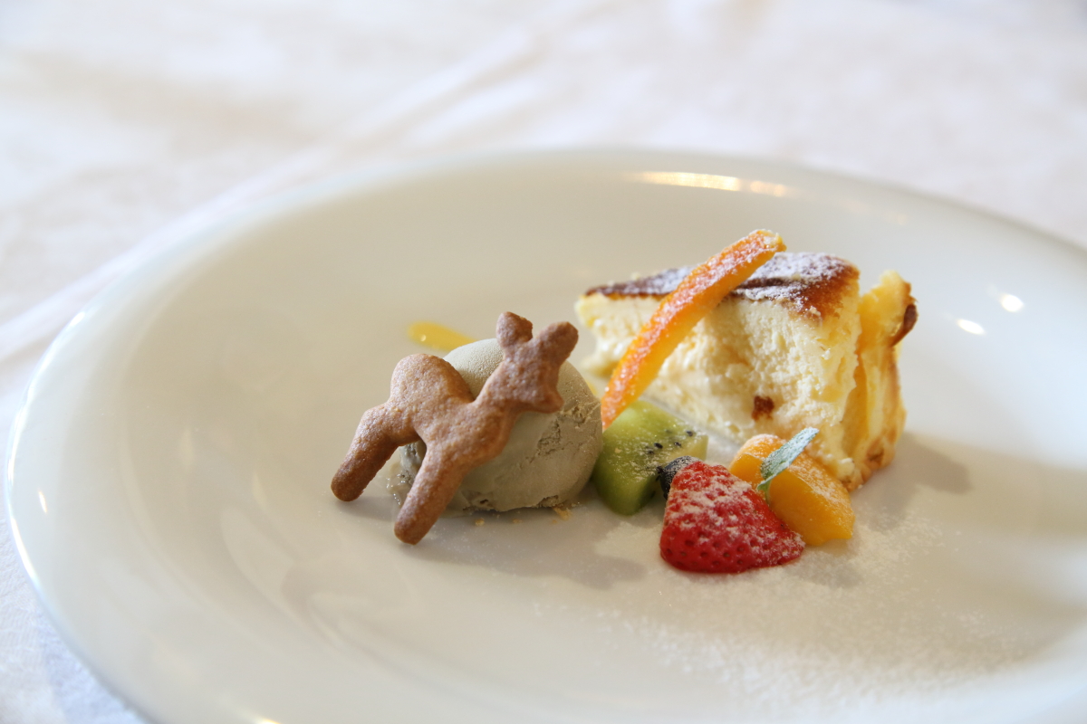 デザートはイタリアンプリン、苺のパンナコッタ、ティラミス、バスクチーズケーキから選べたので、バスクチーズケーキをオーダー。バスクチーズケーキの表面は香ばしく、中はトロッとしてしっとりなめらか。添えられたほうじ茶のアイスクリームが、バスクチーズケーキのおいしさを引き立ててくれました。添えられたクッキーは、宮島に住まう鹿をイメージしているようです♪
