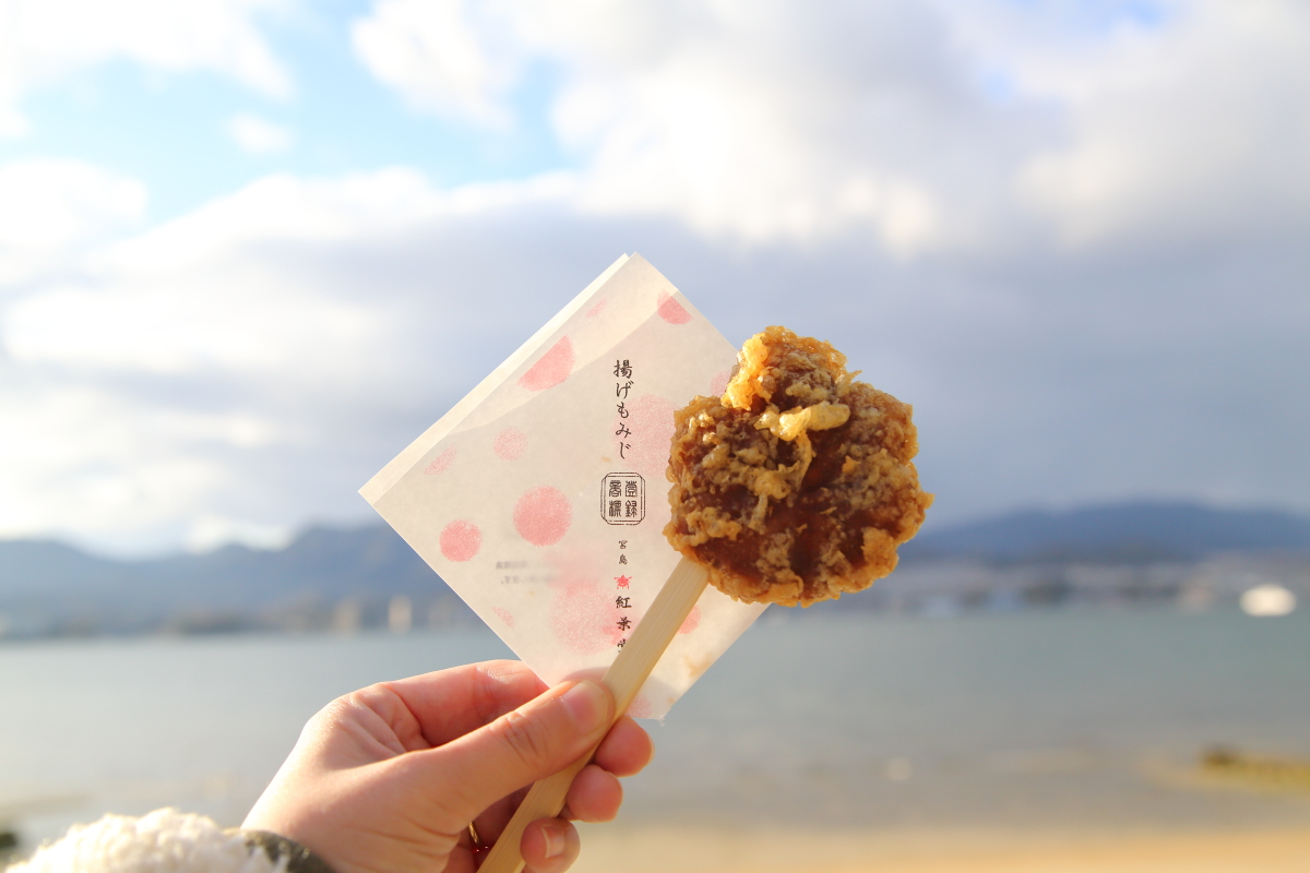 オリジナルの衣を付けてもみじまんじゅうを天ぷらにした、紅葉堂の名物「揚げもみじ®」(クリーム味)200円を購入♪できたての揚げもみじはアツアツで、やさしい味わいの衣はさっくさく。そして中には濃厚なクリームがとろ〜り。