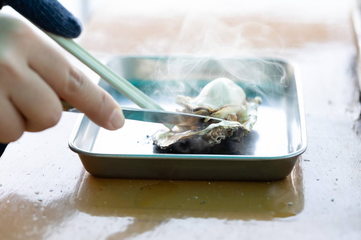 まずは平らな面を下に2分、ひっくり返して6分。中を確認して、水気がなく焼き色がついていたら「食べていいよ」の合図。牡蠣殻が開いた瞬間、「わ〜!」と歓声が上がります!