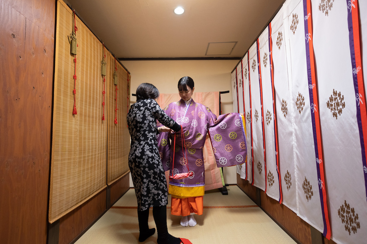 今回体験したのは「平安壺装束プラン」。着付けをしてもらった後、1000年前の文様を再現した平安装束で、宮島内を自由に散策できるというプランです。