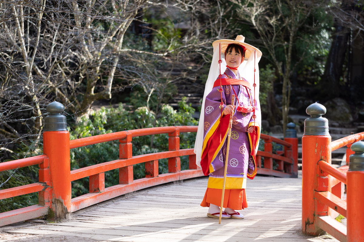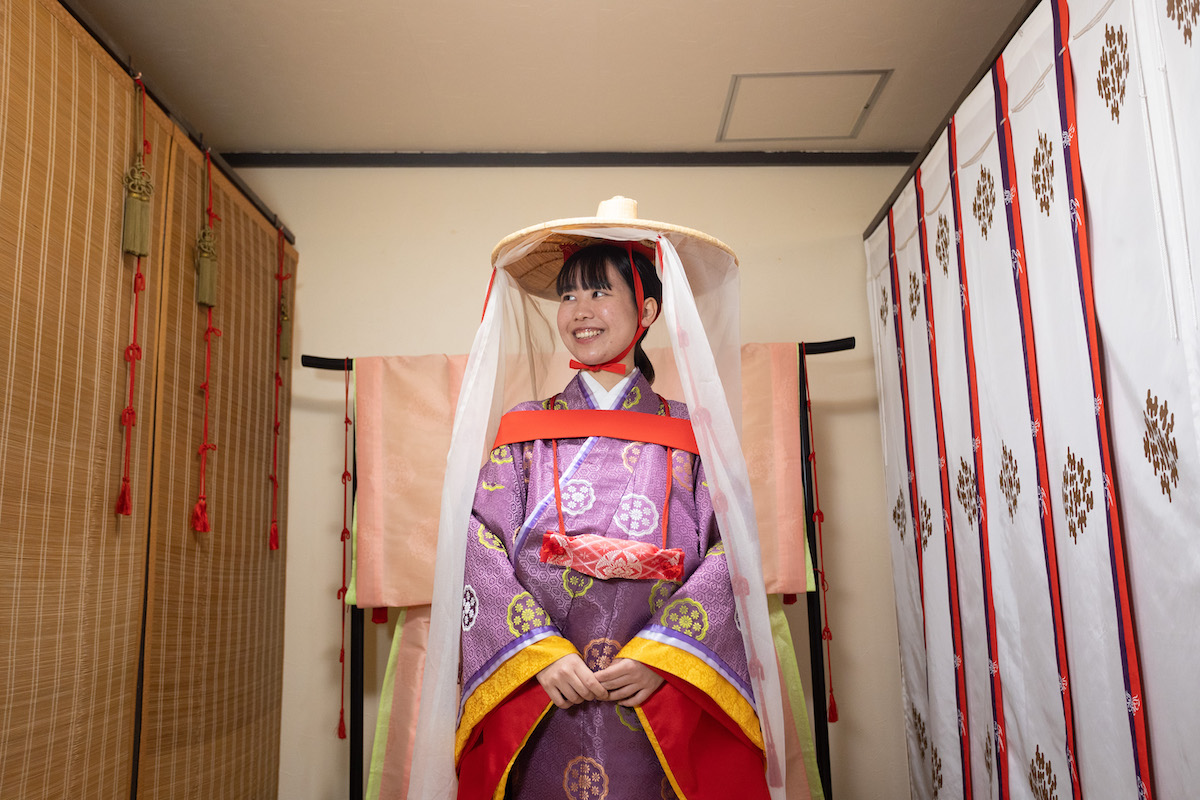 そしてキャンディのような掛け守(かけまもり)を首から下げ、赤い掛け帯を結び、市女笠(いちめがさ)をかぶったら、完成です!