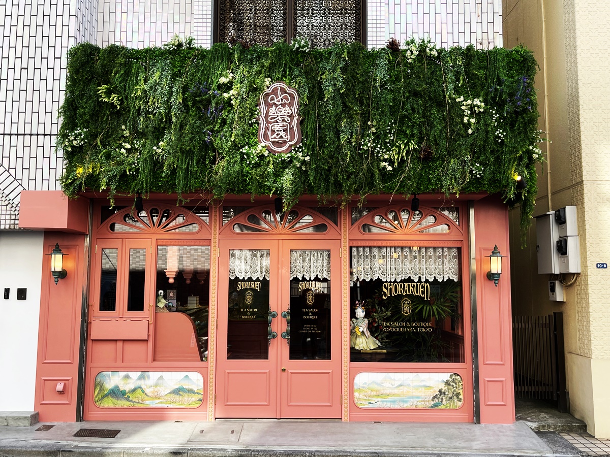 「小楽園 TEA SALON & BOUTIQUE」があるのは、代々木上原駅と代々木八幡駅を結ぶ地蔵通り商店街。桃色の外壁と、グリーンに覆われたファサードが道行く人の目を惹きつけます。
