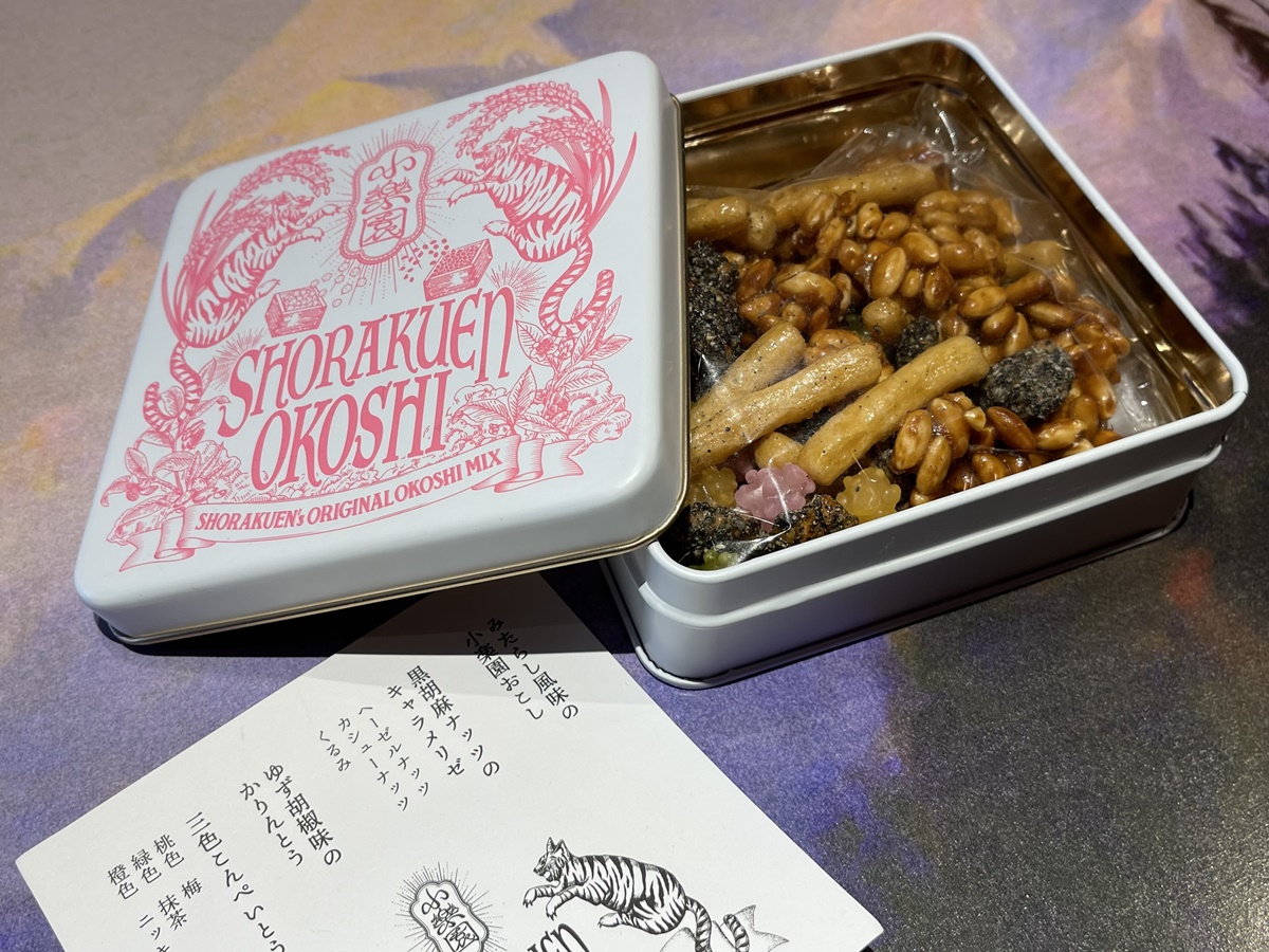 手みやげには「小楽園のおこし」1950円はいかがでしょう。かわいらしいデザインの缶の中に詰まっているのは、みたらし風味のおこしやキャラメリゼしたナッツ、柚子胡椒風味のかりんとうに、金平糖も。甘い×しょっぱいの組合わせに、思わず手が止まりません。
