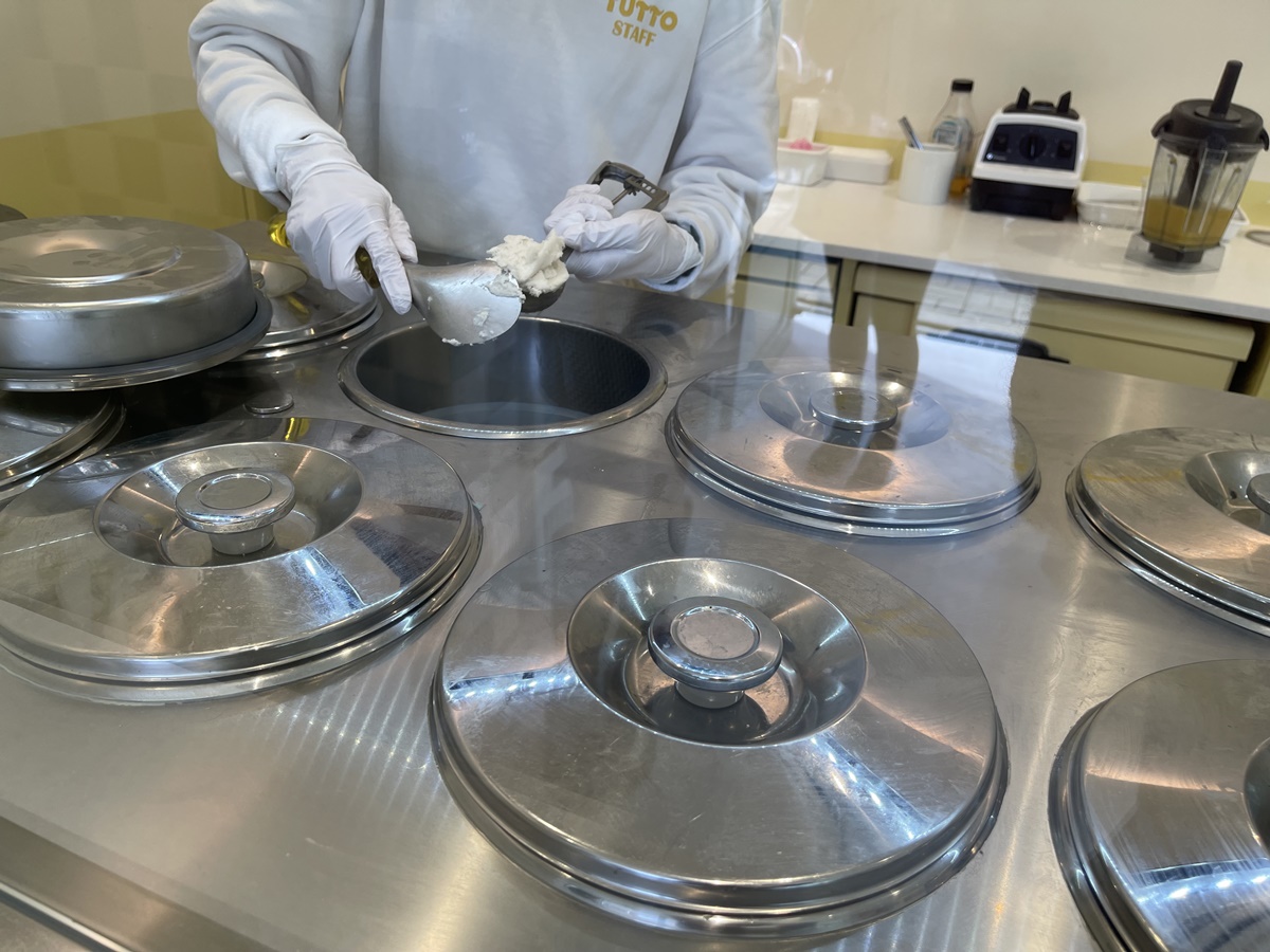 工房では熟練のジェラートマイスターたちが、イタリアの伝統的な製法をそのままに、乳製品や卵、白砂糖を使わないプラントベースのジェラートを作っています。