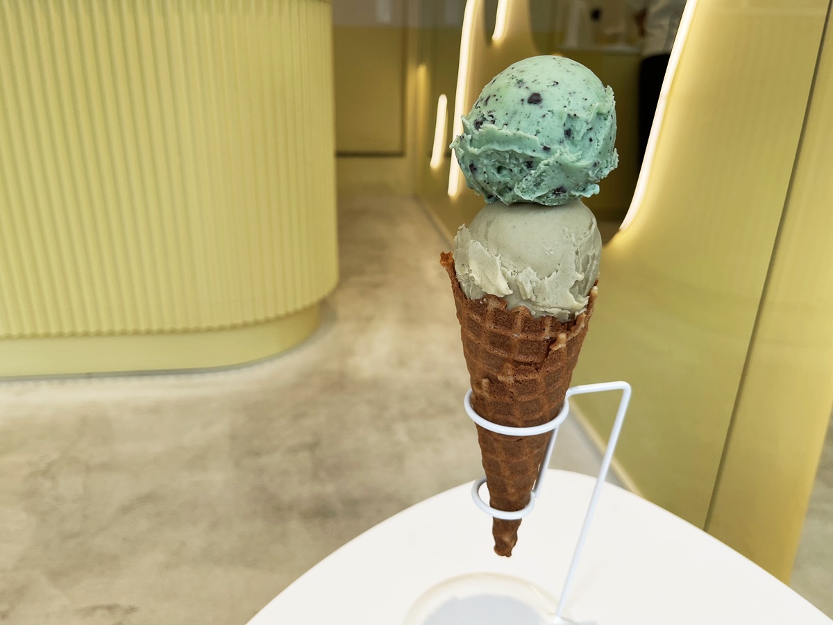 こちらはピスタチオの香りが濃厚な「ブロンテピスタチオ」とさわやかなミントの香りがたまらない「チョコミント」の「ダブルコーン」880円(カップの場合は770円)。コーンもオリジナルで、米粉を使っているんですよ。