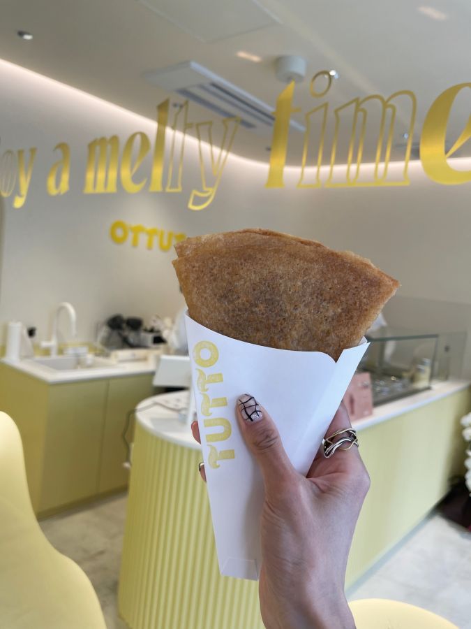 もうひとつおすすめしたいのが、店頭で焼き上げる米粉のクレープ。米粉ならではのモチッ、パリッとした食感が絶妙です。アイスやホイップをトッピングすることも可能ですが、まずはシンプルな「バターシュガー」750円で、生地のおいしさを味わってみてください。