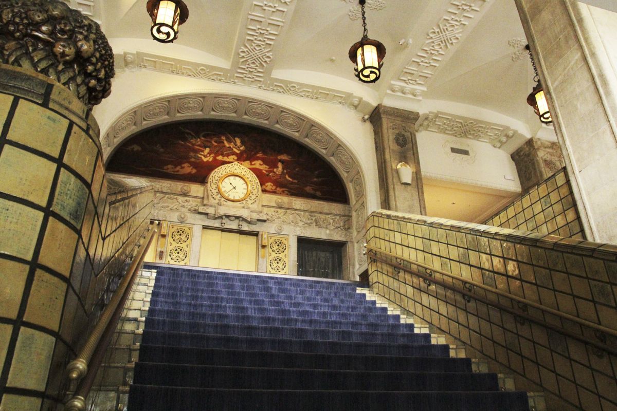 大階段を上がったところに広がる本館2階「ザ・ロビー」は、ぜひ見学しておきたい場所。ただし、ウェディングなどのパーティーや宴席がある時は入室できませんのでご注意を。