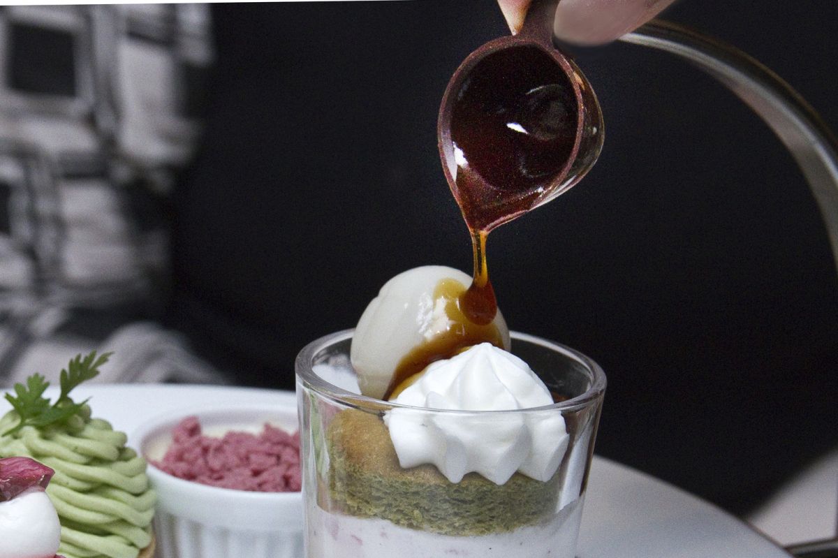 左前は宇治抹茶の風味が豊かに薫る「抹茶モンブラン」、左奥の「桜咲くホワイトチョコスープ」は、咲き誇る桜をイメージしたサクサク食感のチョコフレークの下に、ホワイトチョコのスープが隠されています。