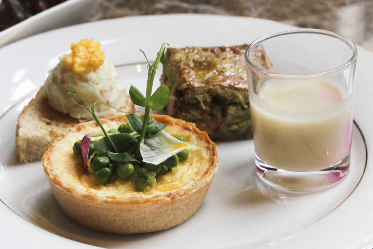 「春の豆とキヌアのタルト」は、くるんと伸びた豆の蔓が、なんともかわいらしいひと品。「桜海老のラスクとポテトサラダ」は、ホテルの自家製パンで作るラスクに、手作りマヨネーズで仕上げる自慢のポテトサラダをのせたもの。
