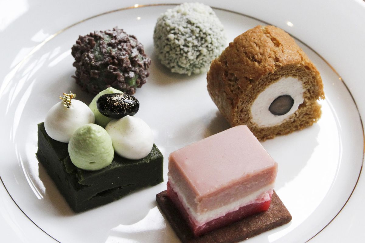 手前から時計回りに、甘酸っぱいイチゴの風味が凝縮された菱餅風の「苺のガトー」、2種の滑らかなホイップクリームがのった「抹茶ブラウニー」、チョコフレークと砕いたナッツで覆われた「抹茶の生チョコ2種」、やさしい甘さの「黒糖ロールケーキ」。どれも小さいながら、濃厚で、バラエティに富んだ味と香りが楽しめます。