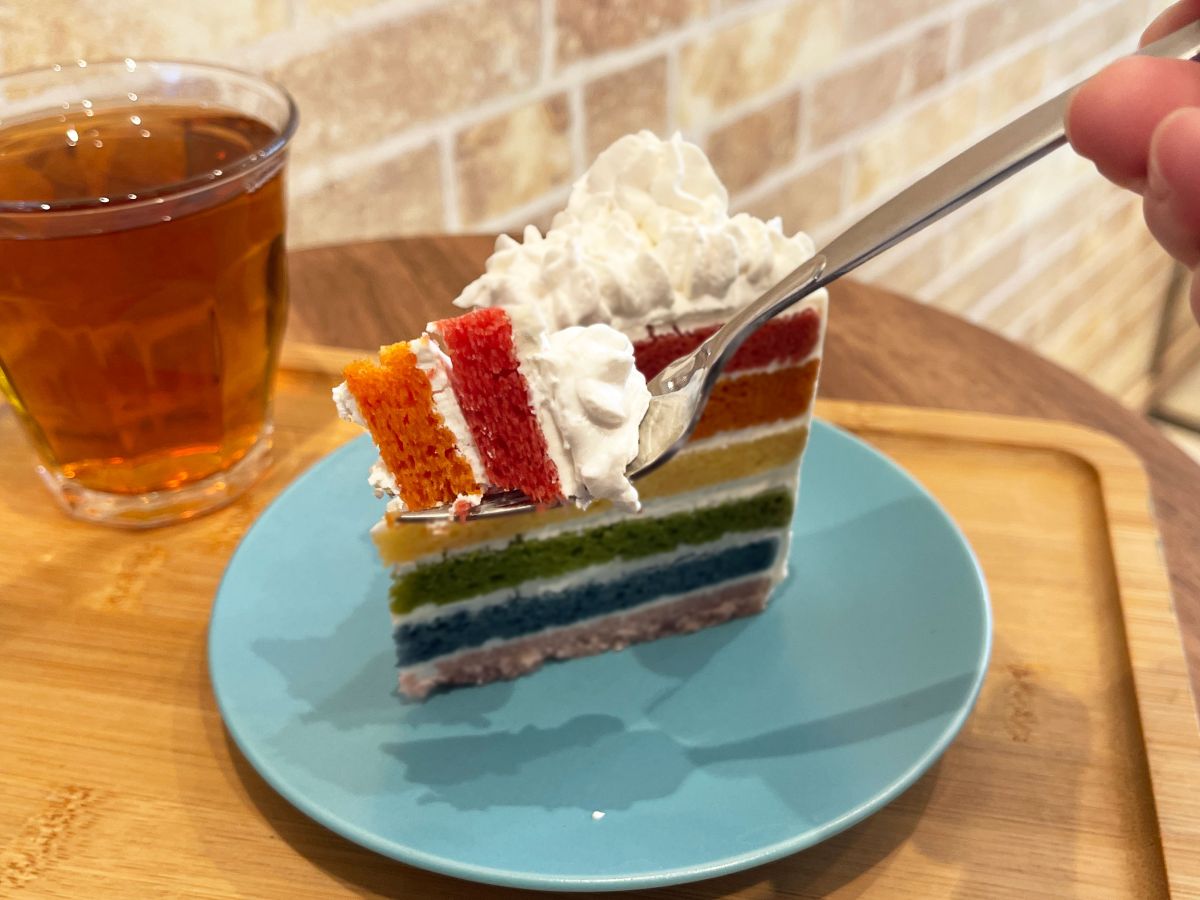 看板メニューは、カラフルさが目を引く「夢幻レインボーケーキ」。このケーキが誕生したきっかけは、食べる人に元気を与えつつ、ヴィーガンのおいしさを知ってもらえるような印象的なケーキを作りたかったからなのだとか。