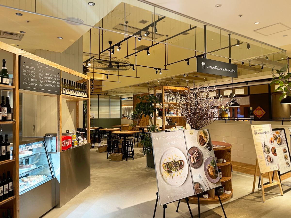 「Cosme Kitchen Adaptation(コスメキッチン アダプテーション)」は、ナチュラル&オーガニック化粧品を扱う「Cosme Kitchen」が運営する、体と地球にやさしいカフェレストラン。今回は、2023年1月に各線渋谷駅から直結の「渋谷ヒカリエ」の7階にオープンした新店舗へ。店内はグリーンを基調とし、おしゃれで開放的。個室もあり、テーブル席が充実しているので女子会にはもってこいです。