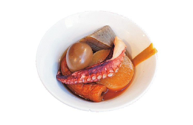 おでんのだしにも焼きアゴを使用しています。おでん単品は100円からで、写真は「おでん盛り(5点盛り)」650円。屋台には珍しくタコの足350円も食べることが出来ます。