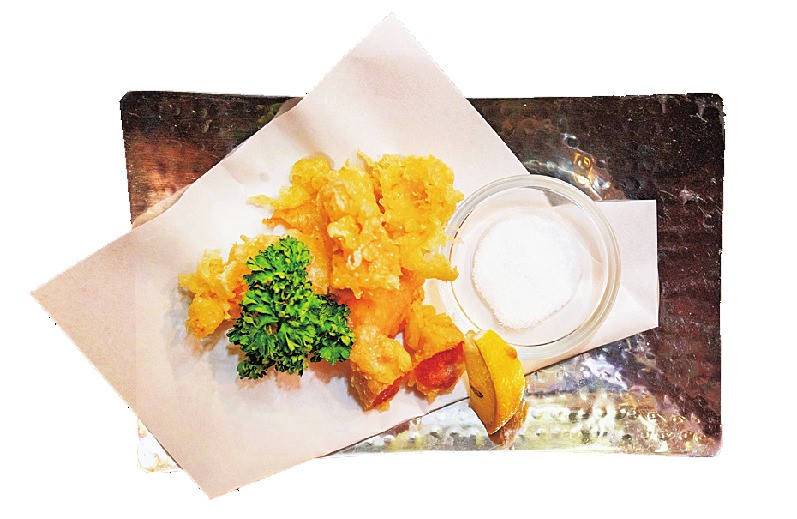 この屋台では天ぷらも自慢で、明太子のほか、きびなごや黒毛和牛も提供しています。写真は「明太子天ぷら」770円。さっぱりと塩でいただきましょう。