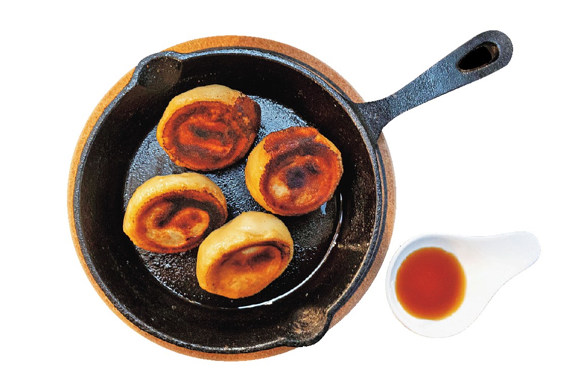鉄鍋のスキレットを使ったメニューは8種類あり、「鉄鍋肉汁爆弾ギョーザ」650円は(写真)はひと口噛めば肉汁があふれ出るほどうま味が凝縮。ほかに「豚バラ」200円などの焼き鳥や、「ラーメン」700円~もあります。