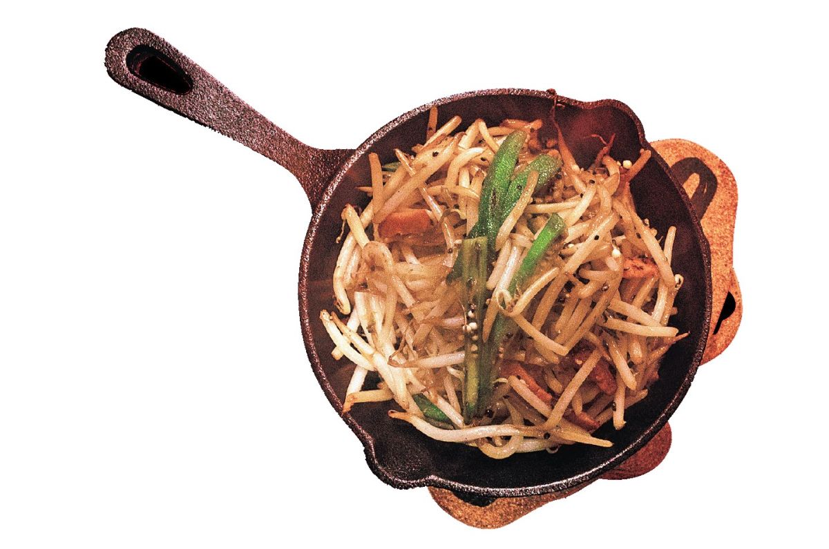 「オクラともやしのこしょう和え」520円は、アツアツの鉄鍋で提供。シャキシャキのモヤシがたまりません。