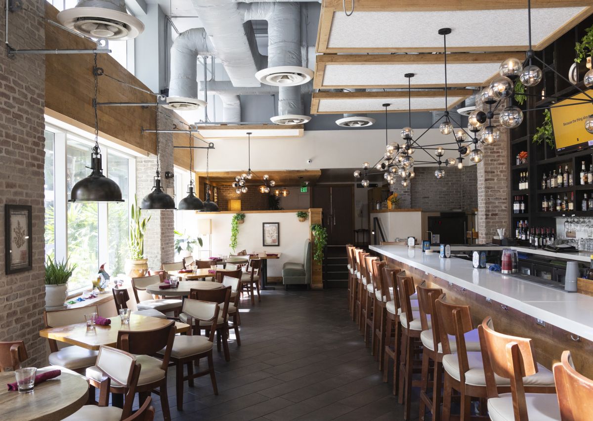 高い天井と大きな窓を備えた店内は、ワイキキの中心にあるとは思えないほど広々としていて開放感抜群。このスタイリッシュな空間に、シックな色の家具やレンガを取り入れることで、モダンながらも落ち着いた雰囲気となっています。