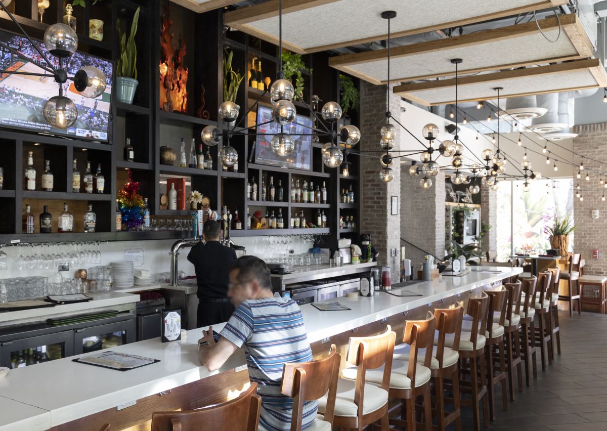 エントランスを入って右側にあるバーカウンターは、ショッピングの合間やビーチ帰りに気軽に立ち寄れるカジュアルさが人気で、開店直後から次々に席が埋まっていきます。