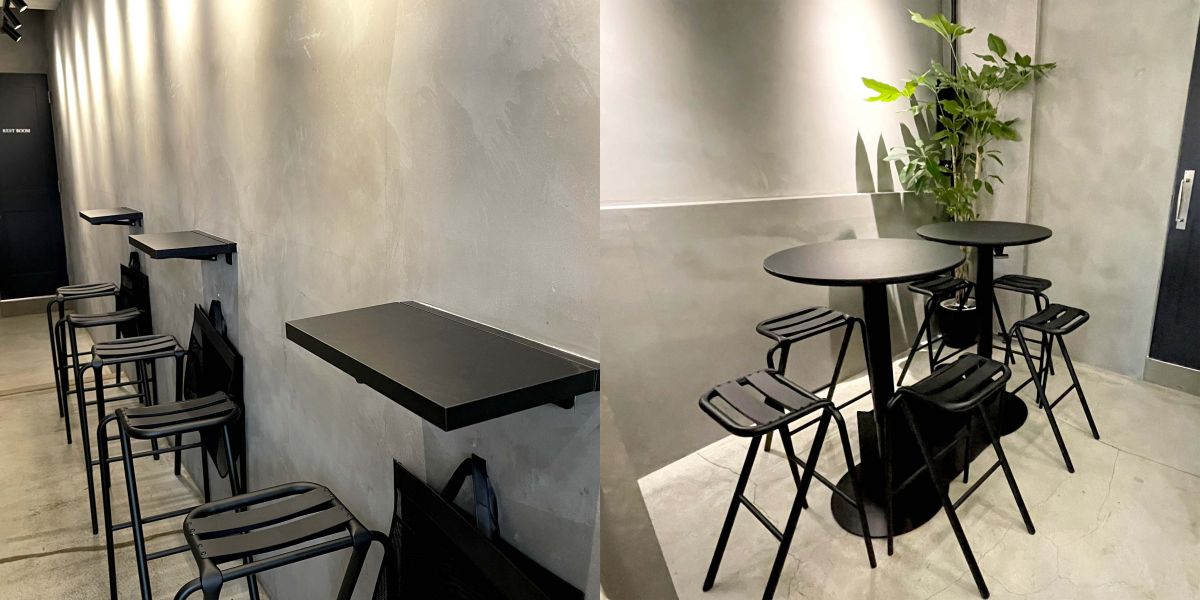 クールなブラックの椅子は足置き付きで、席には荷物入れもしっかり完備。